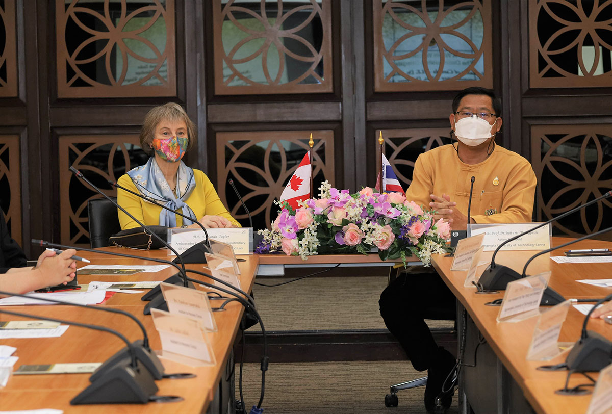 วันที่ 6 พฤษภาคม 2565 ผู้ช่วยศาสตราจารย์ ดร.จัตตุฤทธิ์ ทองปรอน รักษาราชการแทนอธิการบดี พร้อมด้วยผู้บริหารมหาวิทยาลัยเทคโนโลยีราชมงคลล้านนา ให้การต้อนรับ H.E. Ambassador Dr.Sarah Taylor (ดร.ซาราห์ เทย์เลอร์) เอกอัครราชทูตแคนาดาประจำประเทศไทยและคณะ ในโอกาสที่เข้ามาเยี่ยมชมมหาวิทยาลัย หารือแนวทางความร่วมมือ และแลกเปลี่ยนข้อมูลในด้านของเทคโนโลยีสะอาด และพลังงานทดแทน ระบบรางรถไฟฟ้า และ Smart Farming พร้อมทั้งการสานต่อความสัมพันธ์กับมหาวิทยาลัยในแคนาดาด้านศิลปะ และสร้างความร่วมมือทางวิชาการในด้านวิศวกรรมศาสตร์ วิทยาศาสตร์ การเกษตร และบริหารธุรกิจ ณ ห้องประชุมกาสะลอง อาคารสำนักงานอธิการบดี มหาวิทยาลัยเทคโนโลยีราชมงคลล้านนา