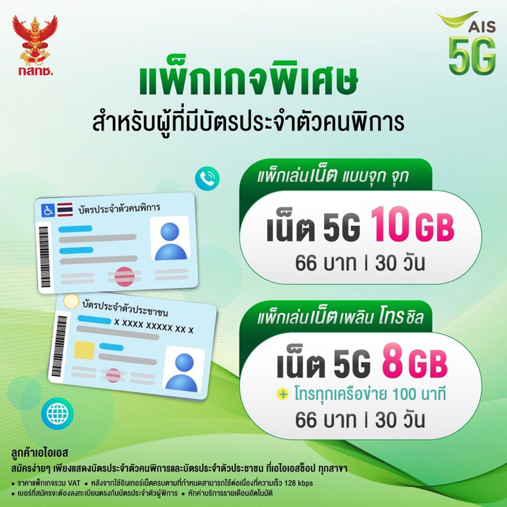 • ส่วนแรก : เอไอเอส ร่วมกับ กสทช. ออกแพ็กเกจเสริมเพื่อผู้พิการทุกกลุ่ม ในราคาสุดคุ้มเพียงเดือนละ 66 บาท (รวมภาษีแล้ว) โดยมี 2 แพ็กเกจ ให้ลูกค้าสามารถเลือกสมัครได้อย่างตอบโจทย์ ไม่ว่าจะเน้นเล่นเน็ต หรือเล่นทั้งเน็ตและโทรได้แก่