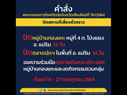 เชียงใหม่ สั่งปิดเพิ่ม 2 หมู่บ้าน พื้นที่เชียงดาวและแม่ริม พร้อมร้านสปา 1 แห่ง ปิด 14 วัน พบผู้ติดเชื้อเป็นกลุ่มก้อน
