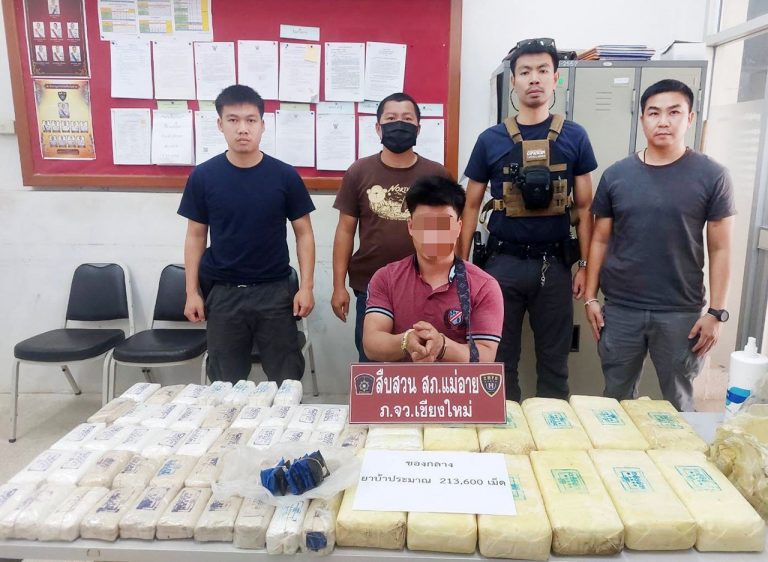 ตำรวจแม่อายขับรถไล่ล่าหนุ่ม ซิ่งรถกระบะขนยาบ้า เตรียมนำไปส่งให้กับลูกค้า ยึดยาบ้าได้ 213,600 เม็ด
