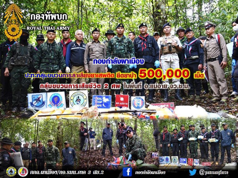 เชียงใหม่ กองกำลังผาเมือง ปะทะขบวนการยาเสพติดที่แม่อาย ยิงดับ 2 ศพ ยึดยา 5 แสนเม็ด