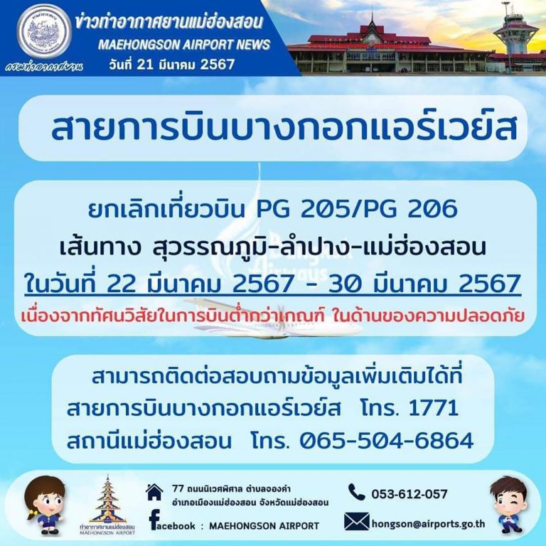 แม่ฮ่องสอน ยกเลิกเที่ยวบินถึงสิ้นเดือน หลังได้รับผลกระทบจากหมอกควันไฟป่า