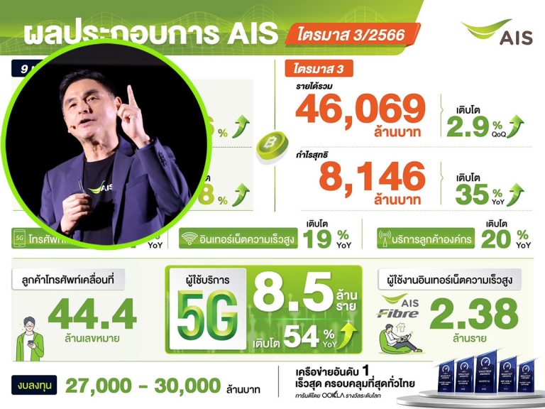 AIS โชว์ผลงานไตรมาส 3/2566 เติบโตแข็งแกร่งทั้ง มือถือ – เน็ตบ้าน – และบริการลูกค้าองค์กรเปิดรายได้ 9 เดือนแรก 137,555 ล้านบาท ตอบรับการเป็น Cognitive Tech-Co