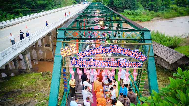นายอำเภอปาย นำชาวเมืองปายและนักท่องเที่ยว ทำบุญออกพรรษา ย้อนรอย 77 ปี สะพานประวัติศาสตร์ปาย