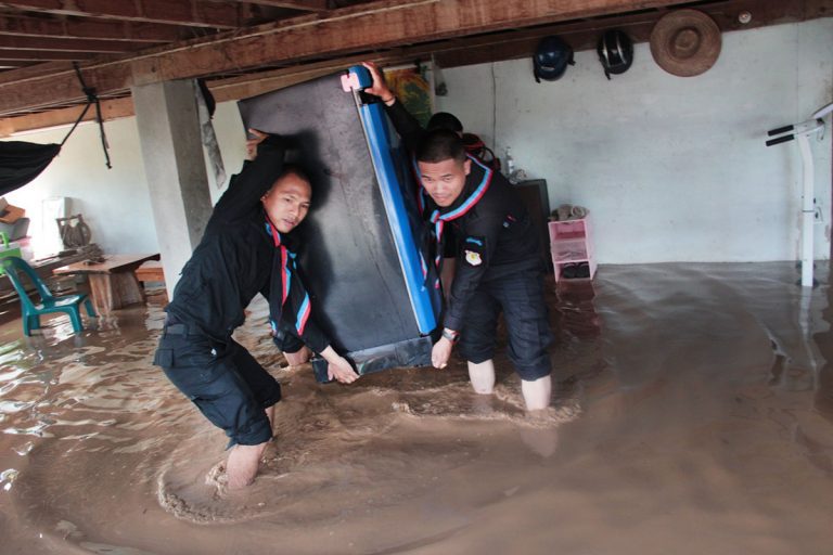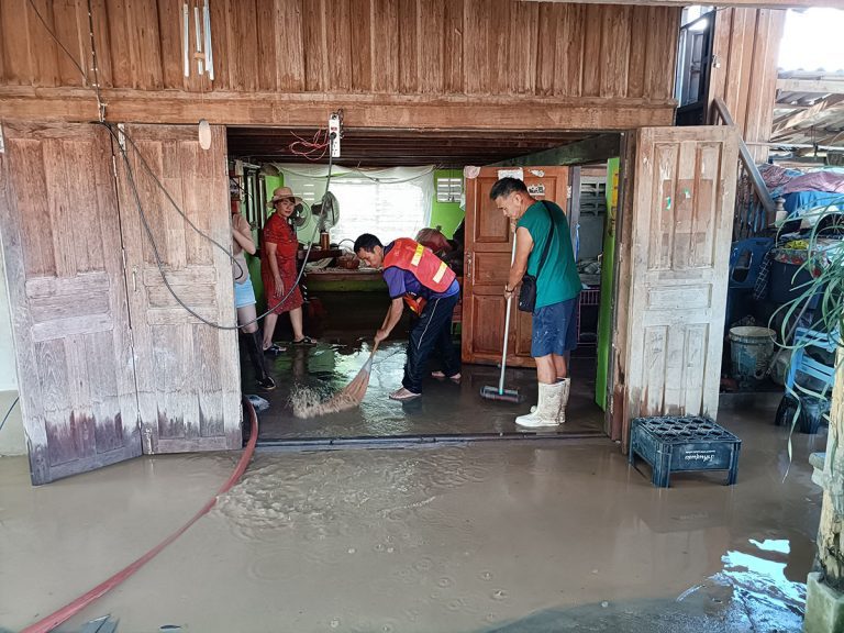 ล้างทำความสะอาดบ้านเรือนหลังน้ำลด อบต.บ้านกาศ จัดรถน้ำพร้อมกำลังคนช่วยราษฏรบ้านพะมอลอ