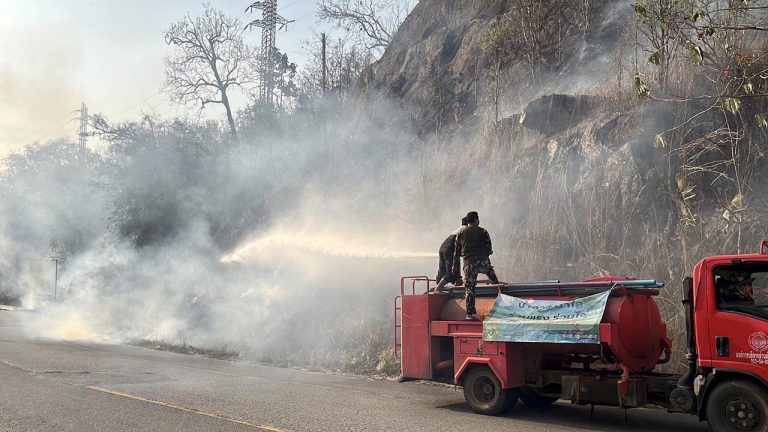 นายอำเภอแม่สะเรียงนำทีมลุยดับไฟ หลังอุทยานแห่งชาติแม่สะเรียง พบควันไฟป่าคลุ้ง