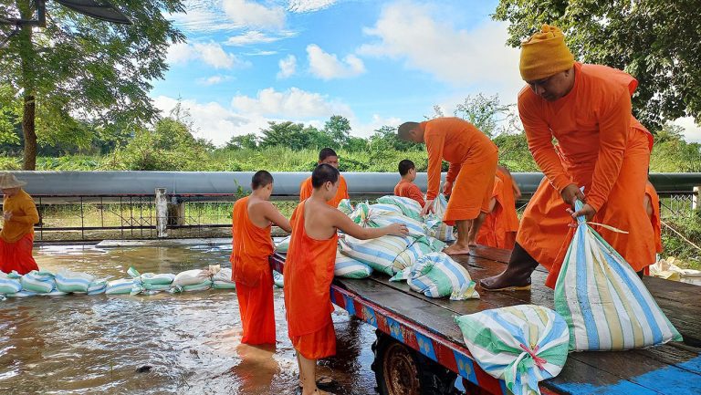 (คลิป) ช่วยเหลือตัวเองให้รอดก่อน ฝนตกซ้ำกลางดึก พระวัดศรีโคมคำวุ่นขนกระสอบทราย สูบน้ำ ป้องกันวิหารหลวง (พระเจ้าตนหลวง) สุดชีวิต