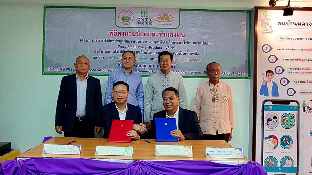 วันที่ 31 ต.ค. 67 ที่ห้องประชุมเทศบาลตำบลบ้านหลวง อ.จอมทอง จ.เชียงใหม่ นายทศพล เผื่อนอุดม รองผู้ว่าราชการจังหวัดเชียงใหม่ นายก่อชิ เพชรไพรพนาวัลย์ นายกเทศมนตรีตำบลบ้านหลวง อ.จอมทอง ทั้งสอง เป็นพยานในพิธีลงนามข้อตกลงร่วมลงทุนโครงการบริหารกำจัดขยะมูลฝอยชุมชนปราศจากมลพิษ ผลิตกระแสไฟฟ้าขนาดเล็ก (Very Small Power Product : VSPP) กำลังผลิตติดตั้งไม่เกิน 10 MW(เมกะวัตต์) โดยใช้ขยะมูลฝอยชุมชนเป็นเชื้อเพลิง บริษัทเอกชนนำโดย MR.เจ้า เตเปี่ยน (Mr. Cao Debiao) CEO บริษัท China Tlanying Inc. หรือ บริษัท CNTY ลงนามกับนายบัณฑิต เดชฤาษี กรรมการผู้จัดการ บริษัท เซเว่นซัน 2514 โดยมีสักขีพยานอีกคือเจ้าหน้าที่อำเภอจอมทอง ชมรมกำนันผู้ใหญ่บ้านในพื้นที่ อ.จอมทอง และนายก อปท.ในพื้นที่ และสมาพันธ์นักธุรกิจเก็บขนสิ่งปฏิกูลมูลฝอยภาคเหนือ (เชียงใหม่) ร่วมในพิธี