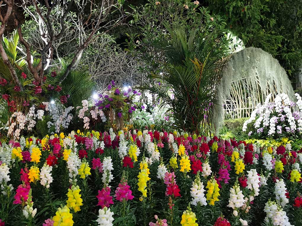 โดยมีรูปแบบการประดับตกแต่งภายในงานที่มีความน่าสนใจ ประกอบด้วย 7 แดนเนรมิตมหัศจรรย์ จุดแรกเป็น Tree of Heaven ต้นไม้แห่งสรวงสวรรค์ ที่เปรียบเสมือนใจกลางของโลก ที่คอยส่องแสงสุขสกาวนำทางความหวังไปสู่มวลมนุษย์ ผ่านเส้นทางซุ้มรูปหัวใจ ที่สื่อถึงการส่งความสุข ไปยังหัวใจของทุกคน จุดที่ 2 Garden of Hope สวนแห่งความหวัง เป็นซุ้มทางเดินที่ล้อมรอบไปด้วยสวนดอกพิทูเนีย ดอกไม้แห่งความ ไม่สิ้นหวังที่เบ่งบานพร้อมกัน ให้ผู้ที่ก้าวมายังสวนแห่งนี้ ได้เติมเต็มความหวังและแรงบันดาลใจในการสู้ชีวิตต่อไป จุดที่ 3 Queen of Flora ราชินีดอกไม้ผู้งดงามที่ออกมาต้อนรับเหล่าผู้มาเยือน พร้อมดลบันดาลให้เหล่าพฤกษานานาพันธุ์ได้เบ่งบานเต็มท้องทุ่งสู่นครบุปผาแห่งนี้ จุดที่ 4 Aurora Borealis เส้นทางแห่งออโรร่า อุโมงค์ทางเดินที่ประดับประดาด้วยไฟเป็นทางยาวเปรียบเสมือนแสงเหนือที่ส่องสว่างบนท้องฟ้ายามราตรีที่มีความสวยงามตระการตา จุดที่ 5 Orchids of Paradise อุโมงค์สวนกล้วยไม้นานาพันธุ์ ที่ออกดอกเบ่งบานหลากสีสัน ส่งกลิ่นหอมฟุ้งเป็นทางยาว เปรียบเสมือนเส้นทางแห่งความมั่งคั่ง ความรัก และความสง่างาม ที่จะก้าวไปสู่ความสำเร็จในชีวิต จุดที่ 6 Fantasy Happy Barn โรงนาแห่งความสุข อุโมงค์ทางเดินที่ให้บรรยากาศแบบโรงนา ที่เต็มไปด้วยแปลงดอกไม้เมืองหนาวหลากสายพันธุ์ ที่เบ่งบาน มอบความสุขให้กับผู้ที่มาเยี่ยมชม และจุดที่ 7 Elysium Fields ท้องทุ่งดินแดนสุขาวดี พื้นที่บริเวณเวทีกลางที่ล้อมรอบไปด้วยทุ่งรวงข้าวสีทองที่เปล่งประกายงดงาม ราวกับทุ่งเอลิเซียมในดินแดนสวรรค์ซึ่งเป็นสวรรค์ชั้นสูงสุดจากเทพปกรนัมของกรีก เป็นพื้นที่แห่งความสุขที่น่าอภิรมย์สูงสุดของมวลมนุษย์
