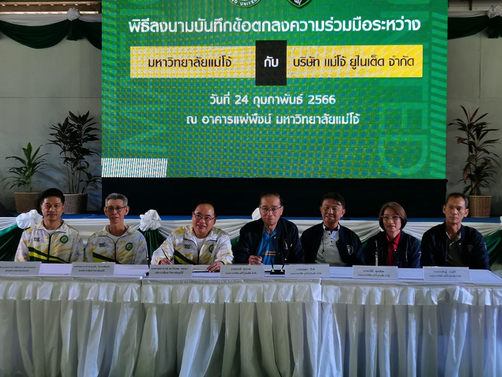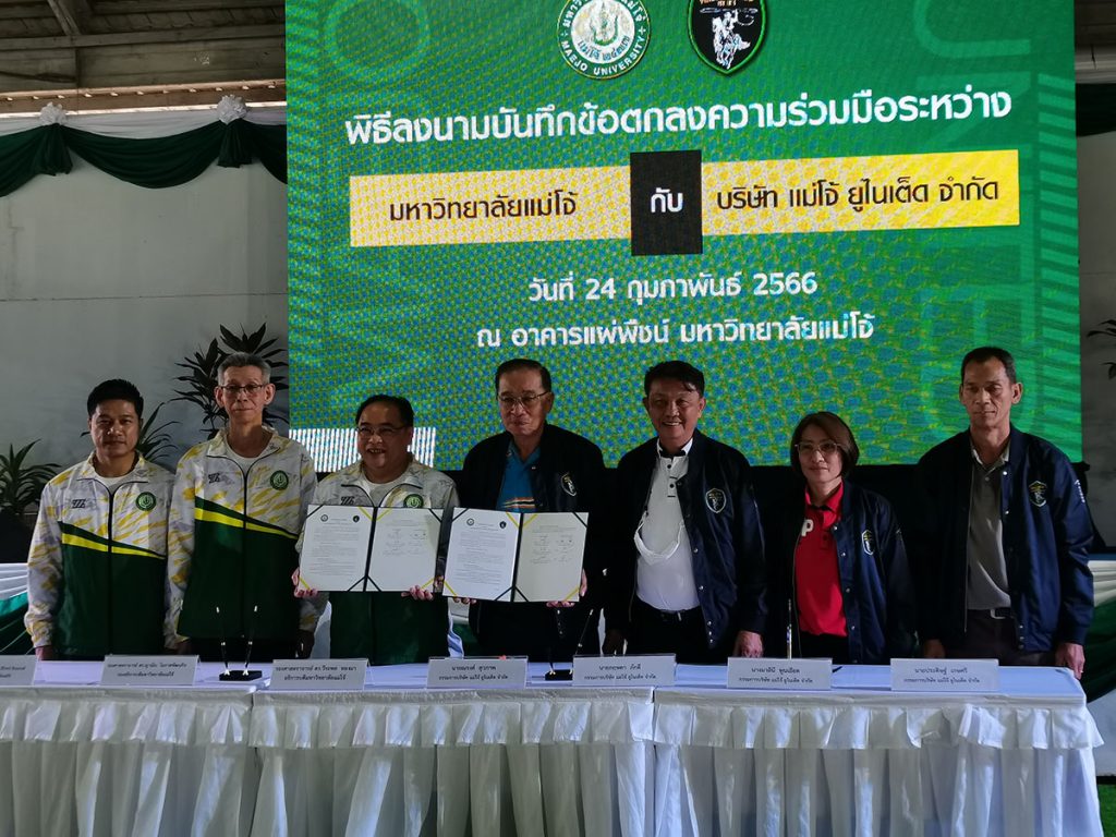 วันศุกร์ที่ 21 กุมภาพันธ์ 2566 มหาวิทยาลัยแม่โจ้ จัดพิธีลงนามบันทึกข้อตกลงความร่วมมือ กับ บริษัท แม่โจ้ ยูไนเต็ด จำกัด โดยมี รองศาสตราจารย์ ดร.วีระพล ทองมา อธิการบดีมหาวิทยาลัยแม่โจ้ และ นายณรงค์ สุวภาพ และ นายกฤษดา ภักดี กรรมการบริษัท แม่โจ้ ยูไนเต็ด จำกัด เป็นผู้แทนลงนามของทั้งสองฝ่าย พร้อมด้วยคณะผู้บริหารของทั้ง 2 หน่วยงานร่วมเป็นสักขีพยาน ณ อาคารแผ่พืชน์ มหาวิทยาลัยแม่โจ้ จ.เชียงใหม่