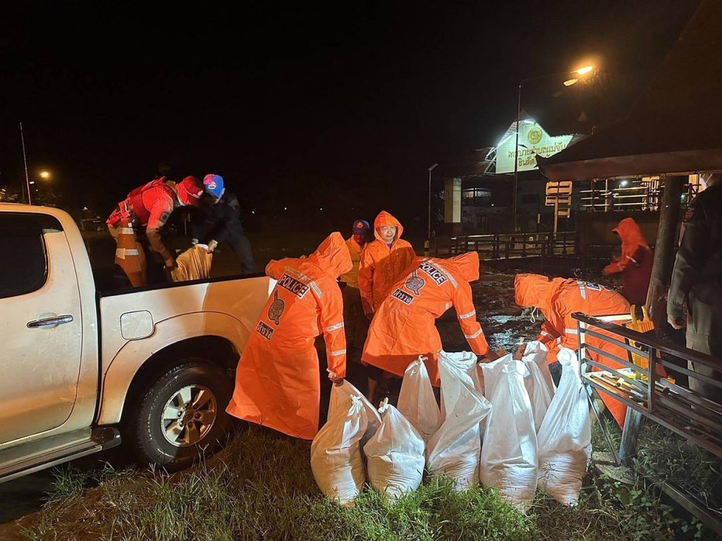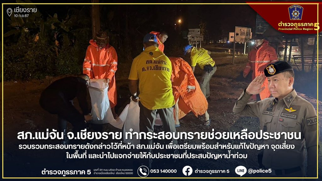 สภ.แม่จัน จ.เชียงราย ทำกระสอบทรายช่วยเหลือประชาชน เพื่อเตรียมพร้อมสำหรับแก้ไขปัญหาจุดเสี่ยงในพื้นที่ และนำไปแจกจ่ายให้กับประชาชนที่ประสบปัญหาน้ำท่วม