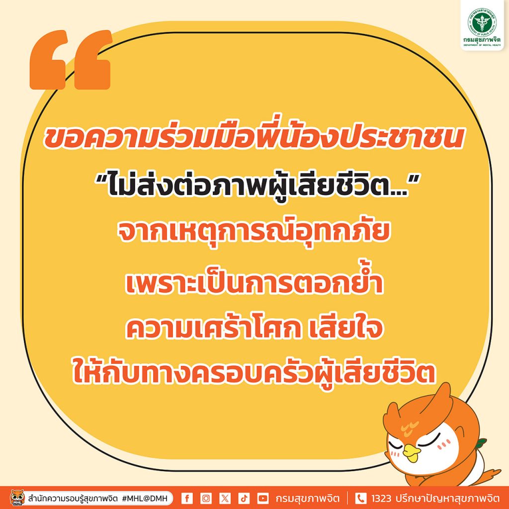 นพ.กิตต์กวี โพธิ์โน ผู้ช่วยอธิบดีกรมสุขภาพจิตและผู้อำนวยการโรงพยาบาลสวนปรุง กล่าวว่า ในเย็นวันนี้ ได้จัดทีมช่วยเหลือเยียวยาจิตใจกรมสุขภาพจิต พร้อมลงปฏิบัติงานเยียวยาจิตใจแก่ผู้ประสบภัยโดยเฉพาะครอบครัวผู้เสียชีวิต สูญหาย