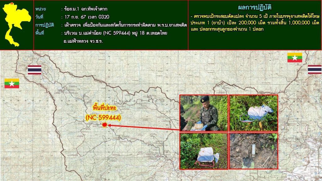 เมื่อ17 ก.ย. 67 เวลา 0320 กกล.ผาเมือง โดย ร้อย.ม.1 ฉก.ทัพเจ้าตาก จัดกำลัง จำนวน 1 ชป. ทำการเฝ้าตรวจ และปะทะกลุ่มขบวนการลักลอบลำเลียงยาเสพติด บริเวณ บ.แม่คำน้อย หมู่ 18 ต.เทอดไทย อ.แม่ฟ้าหลวง จว.ช.ร. ผลการปฏิบัติ ฝ่ายเราปลอดภัย ปัจจุบัน หน่วยได้จัดกำลังเพิ่มเติมจำนวน 2 ชป. วางกำลังควบคุมพื้นที่เกิดเหตุ ต่อมาเมื่อเวลา 0630 หน่วยได้เข้าตรวจสอบที่เกิดเหตุ ผลการปฏิบัติ ตรวจพบเป้กระสอบดัดแปลง จำนวน 5 เป้ ภายในบรรจุยาบ้าเป้ละประมาณ 200,000 เม็ด รวมทั้งสิ้น 1,000,000 เม็ด ไม่พบกลุ่มขบวนการฯ ปัจจุบันอยู่ในระหว่าง จนท. ที่เกี่ยวข้องเข้ามาทำการตรวจสอบที่เกิดเหตุเพิ่มเติม