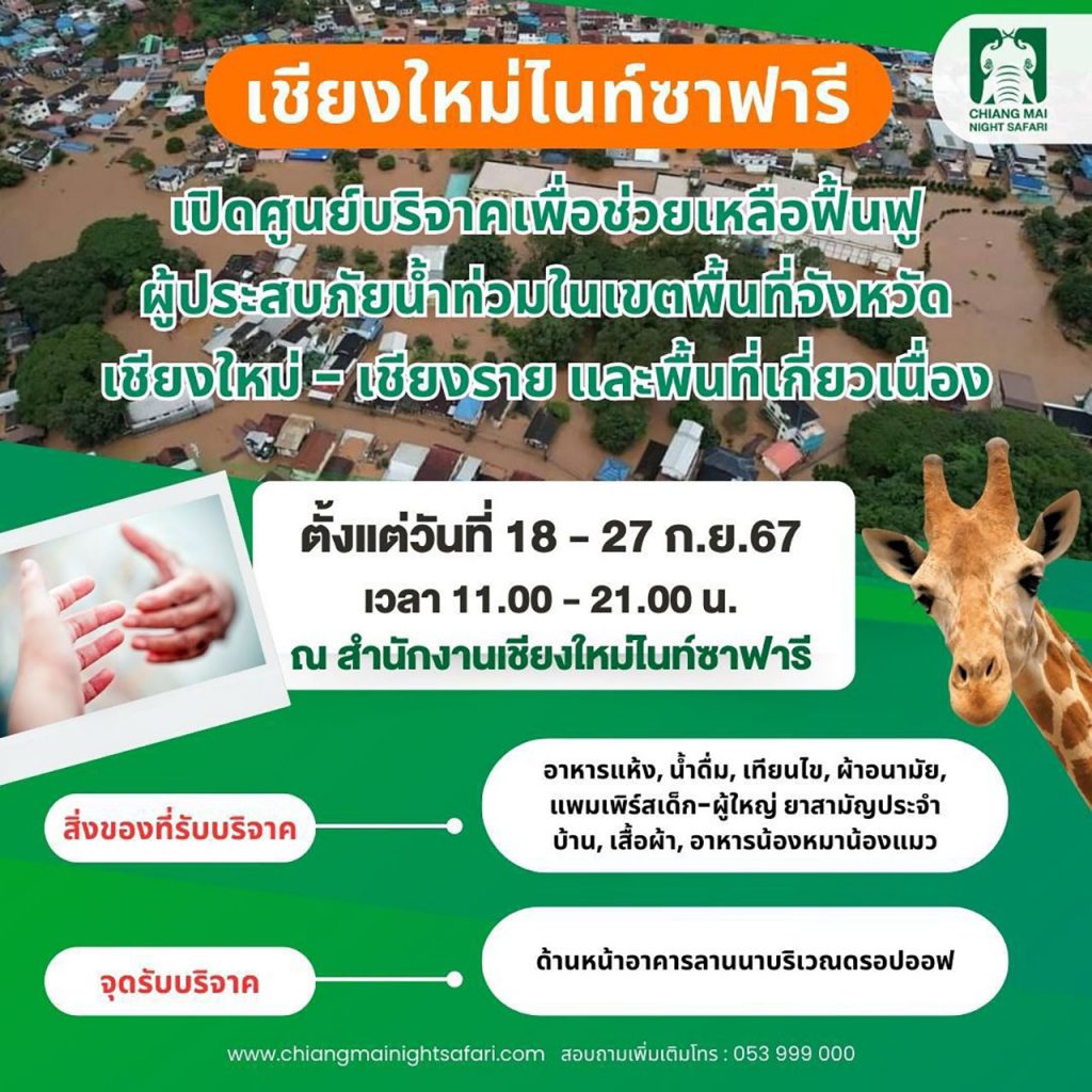 เชียงใหม่ไนท์ซาฟารี เปิด “ศูนย์บริจาคเพื่อช่วยเหลือฟื้นฟูผู้ประสบภัยน้ำท่วม ในเขตพื้นที่จังหวัดเชียงใหม่ – เชียงราย และพื้นที่เกี่ยวเนื่อง”