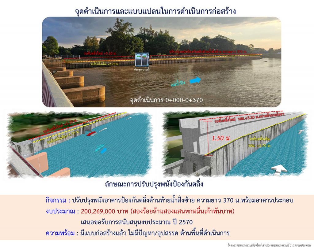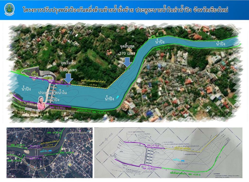 นอกจากนี้ยังมีมาตรการป้องกันน้ำท่วมชุมชนเมือง จำนวน 1 โครงการ วงเงิน 200.269 ล้านบาท เพื่อปรับปรุงพนังป้องกันตลิ่งด้านท้ายน้ำฝั่งซ้าย ตำบลป่าแดดด อำเภอเมือง จังหวัดเชียงใหม่ ความยาว 370 เมตร พร้อมอาคารประกอบ ปัจจุบันมีแบบก่อสร้างแล้ว ไม่มีปัญหาและอุปสรรคด้านพื้นที่ดำเนินการ จากตลิ่งเดิมมีความสูง 3.70 เมตร ทำการก่อปรับปรุงความสูงเพิ่มขึ้นอีก 1.50 เมตร รวมความสูงทั้งหมด 5.20 เมตร ซึ่งสามารถป้องกันอุทกภัยจากน้ำล้นตลิ่งเข้าท่วมพื้นที่ด้านท้ายแม่น้ำปิง และมีมาตรการเร่งระบายน้ำ จำนวน 6 โครงการ วงเงิน 317 ล้านบาท ประกอบด้วยประตูระบายน้ำพร้อมโรงสูบน้ำด้วยไฟฟ้า บ้านท่านาค จ.เชียงใหม่ วงเงิน 49 ล้านบาท , ประตูระบายน้ำพร้อมโรงสูบน้ำด้วยไฟฟ้า บ้านป่ากล้วย จ.เชียงใหม่ วงเงิน 68 ล้านบาท , ปรับปรุงสถานีสูบน้ำด้วยไฟฟ้าร้องเสือเต้น จ.ลำพูน วงเงิน 49 ล้านบาท , ปรับปรุงสถานสูบน้ำด้วยไฟฟ้าสบปะ จ.ลำพูน วงเงิน 45 ล้านบาท , ปรับปรุงสถานีสูบน้ำด้วยไฟฟ้าล้องพะปวน จ.ลำพูน วงเงิน 68 ล้านบาท และมีมาตรการเพิ่มประสิทธิภาพการไหลของนน้ำ จำนวน 1 โครงการ วงเงิน 40 ล้านบาท เป็นการปรับปรุงอาคารป้องกันตลิ่งท้ายอาคารเหมืองร้อง อ.แม่ริม จ.เชียงใหม่ มาตรการช่วยเหลือฟื้นฟู จำนวน 1 โครงการ วงเงิน 49.184 ล้านบาท ทำการจัดซื้อเครื่องจักร เครื่องมือ ยานพาหนะ จำนวน 13 รายการ เช่น รถบรรทุก รถขุดตีนตะขาบ รถตักหน้าขุดหลัง รถฟาร์มแทรกเตอร์ ฯลฯ