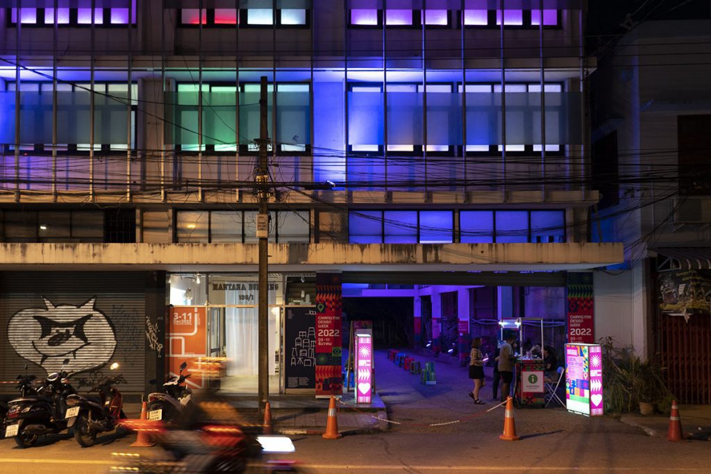 ปิดท้ายที่ ธน-อาคาร หนึ่งในสถานที่จัดงานไฮไลต์ของเทศกาลฯปีนี้ แต่ก่อนเคยเป็นที่ตั้งของธนาคารพาณิชย์ชื่อดัง เป็นอาคารที่มีฟาซาด (facade) ที่ผิวหน้าของอาคารมีลวดลายคล้ายรวงข้าว ซึ่งเป็นจุดเด่นของอาคารแห่งนี้และยังเป็นมรดกทางสถาปัตยกรรมยุคโมเดิร์นของย่านนี้ด้วย ที่ผสมผสานกับโชว์สนุกๆ ของกลุ่มศิลปิน Decide Kit ผู้อยู่เบื้องหลังของงาน แสง-สี-เสียง กับโปรเจ็กต์ ‘เปิ้ลสานฉัน’ ที่จะมาสร้างสรรค์เรื่องราวของงานจักสาน ซึ่งเป็นการค้าขายที่เคยรุ่งเรืองในอดีตให้กลับมามีสีสันอีกครั้ง ด้วยดิจิทัลอาร์ตรูปแบบใหม่