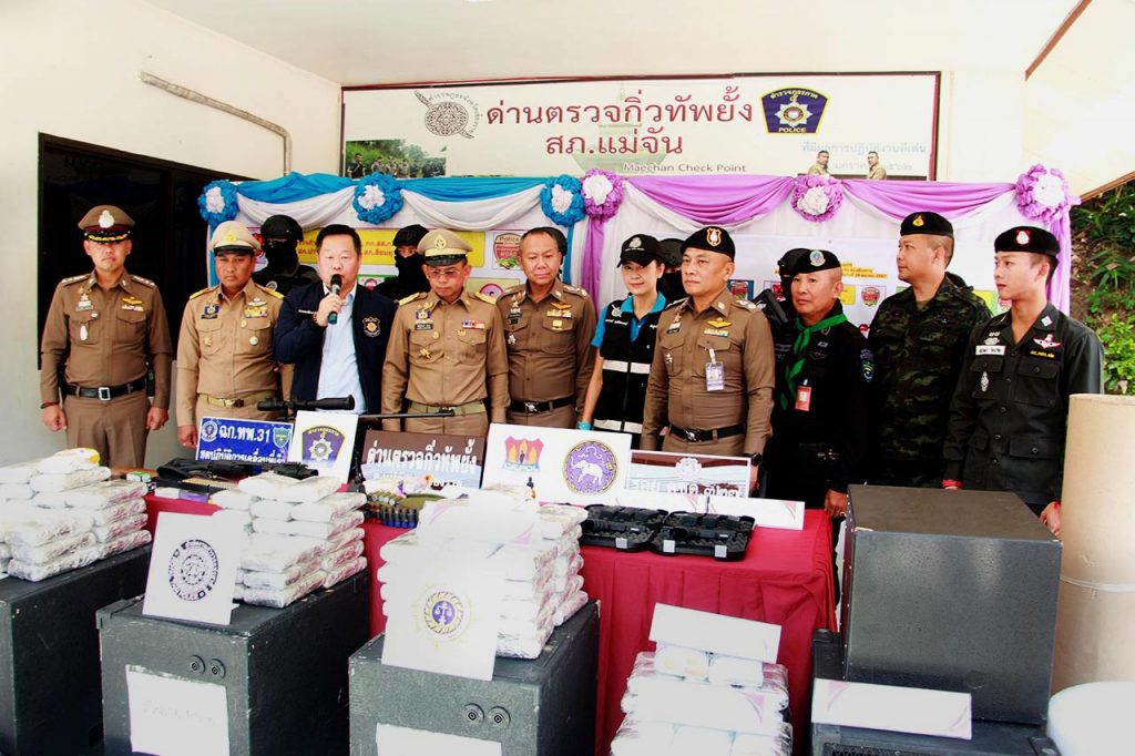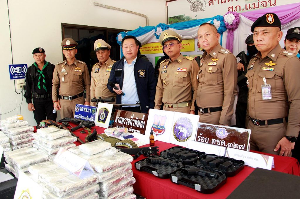 เวลา 13.00 น.วันที่ 23 ตุลาคม 2567 ที่ด่านตรวจกิ่วทัพยั้ง อ.แม่จัน จ.เชียงราย พล.ต.ท.กฤตธาผล ยี่สาคร ผู้บัญชาการตำรวจภูธรภาค 5 พล.ต.ต.มานพ เสนากูล ผู้บังคับการตำรวจภูธรจังหวัดเชียงราย พ.ต.อ.เกียรติศักดิ์ จิตรประสาร ผกก.สภ.แม่จัน นายโชตินรินทร์ เกิดสม รองปลัดกระทรวงมหาดไทย ไปรักษาการผู้ว่าราชการ จ.เชียงราย นายอภิกิต ฉ.โรจน์ประเสริฐ รองเลขาธิการ ป.ป.ส. ทหารกองกำลังผาเมือง และ ร้อย ตชด.327 ได้ร่วมกันแถลงข่าวการตรวจยึดของกลางยาเสพติดประเภทยาบ้าจำนวน 600,000 เม็ด รถยนต์กระบะ 1 คัน รถจักรยานยนต์ 1 คัน อาวุธปืน 5 กระบอกพร้อมเครื่องกระสุนอีกเป็นจำนวนมาก