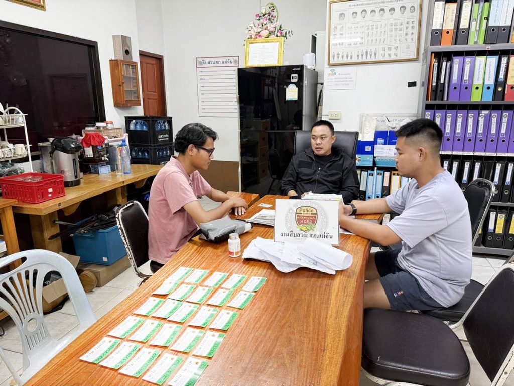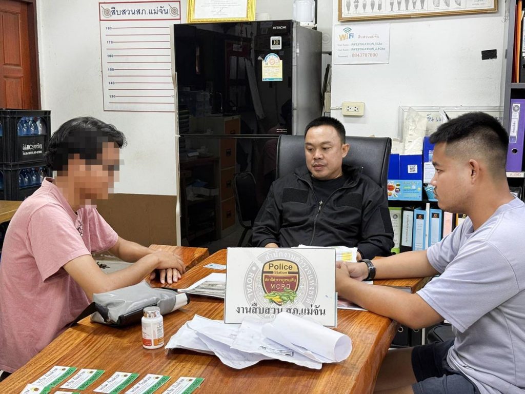 วันที่ 16 มิ.ย. 2568 ตำรวจภูธรจังหวัดเชียงราย โดย พล.ต.ต.มานพ เสนากูล ผบก.ภ.จว.เชียงราย และ สภ.แม่จัน อำนวยการโดย พ.ต.อ.เกียรติศักดิ์ จิตรประสาร ผกก.สภ.แม่จัน จ.เชียงราย สั่งการให้ พ.ต.ต.ผดุง ท้ายเรือคำ สว.สส.สภ.แม่จัน ร.ต.อ.วชิรพัตช์ วรรณสอน , ร.ต.อ.อนันต์ โกเสนตอ , ร.ต.อ.รพีพงศ์ พากเพียร , ร.ต.อ.ศุภชัย ปานโชติ รอง สว.สภ.แม่จัน ร่วมกันจับกุมตัว นายธนากร อายุ 23 ปี ชาว ต.หนองสาหร่าย อ.ปากช่อง จ.นครราชสีมา พร้อมด้วยของกลางนามบัตร บริษัทเงินกู้จำนวน 25 ใบ เครื่องโทรศัพท์มือถือ 2 เครื่อง รถเก๋งโตโยต้า ทะเบียน จ.แพร่