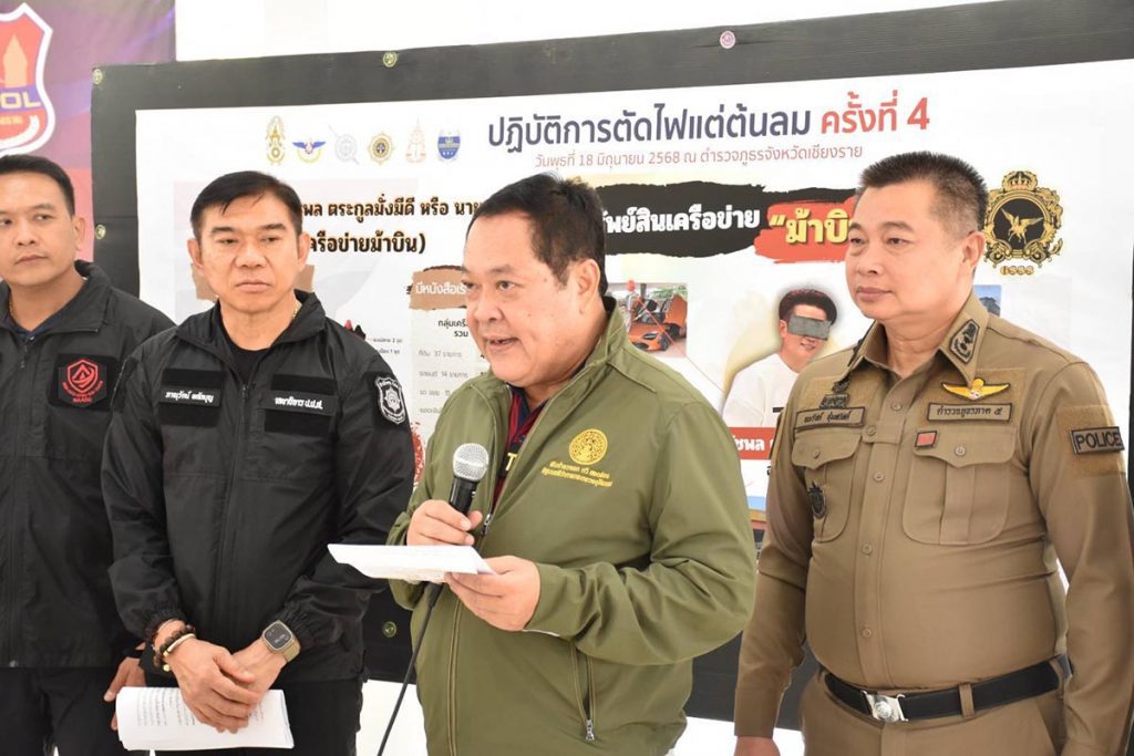เวลา 10.00 น.วันที่ 18 มิ.ย. 68 พันตำรวจเอก ทวี สอดส่อง รัฐมนตรีว่าการกระทรวงยุติธรรม พล.ต.ท. ภาณุรัตน์ หลักบุญ เลขาธิการสำนักงาน ป.ป.ส. นายปฤณ เมฆานันท์ ผู้อำนวยการสำนักปราบปรามยาเสพติด และหน่วยงานที่เกี่ยวข้อง ร่วมแถลงผลปฏิบัติการ “ตัดไฟแต่ต้นลม” ครั้งที่ 4 ในพื้นที่จังหวัดเชียงราย หลังเจ้าหน้าที่กระจายกำลังตรวจค้นเป้าหมาย 3 จุด ได้แก่ คอนโดมิเนียมในเขตเทศบาลนครเชียงราย และบ้านพักในหมู่บ้านปิยะพร อำเภอแม่สาย
