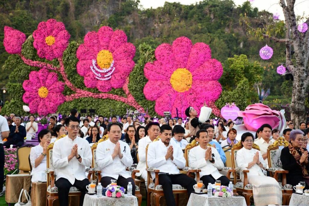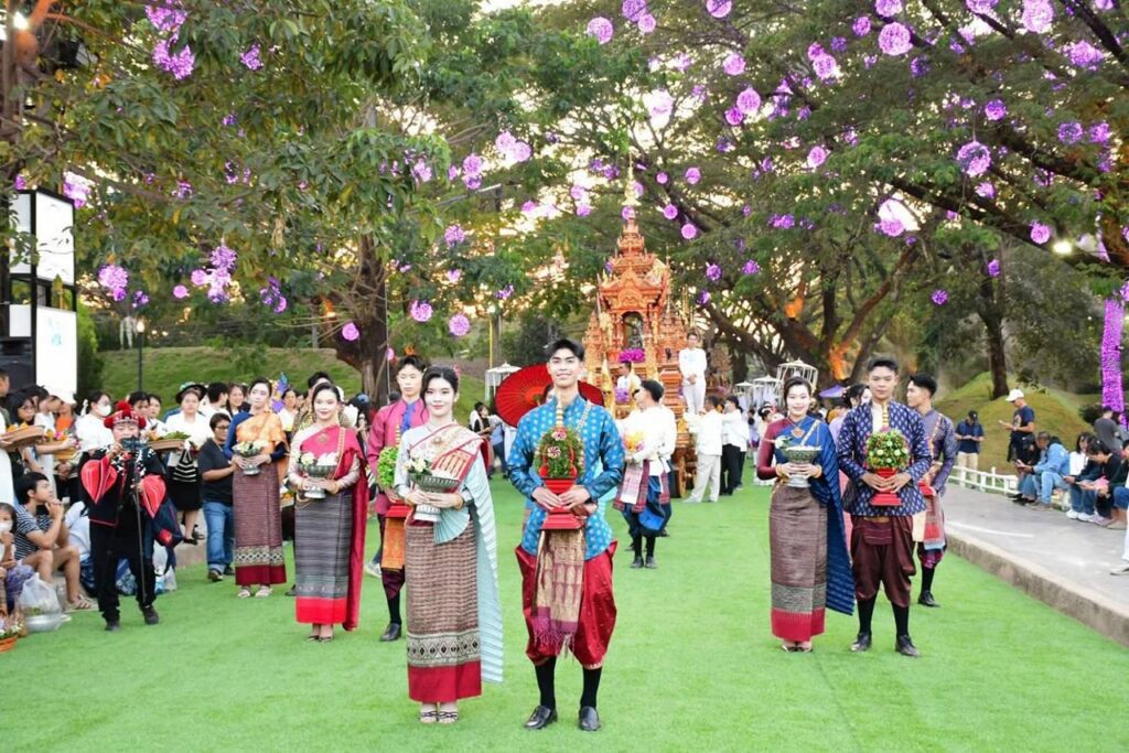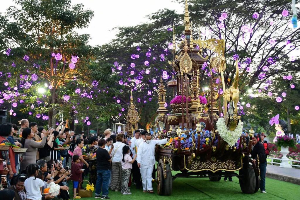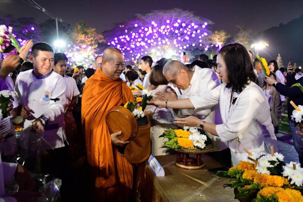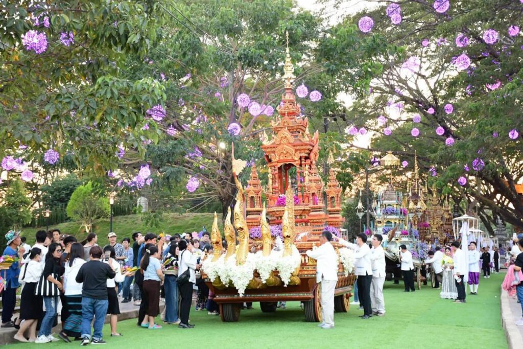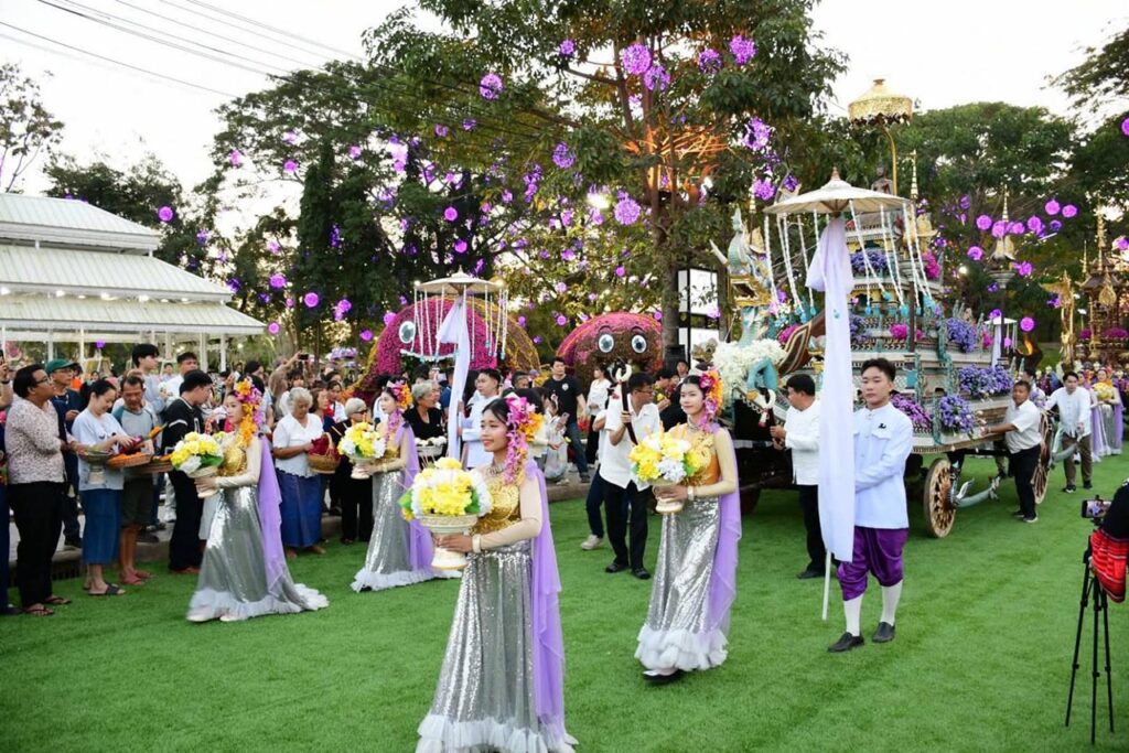 เชียงราย นักท่องเที่ยวคึกคัก ร่วมตักบาตรดอกไม้หนึ่งเดียวในล้านนา ถวายดอกไม้พระพุทธรูปคู่เมือง บนราชรถ 9 คัน
