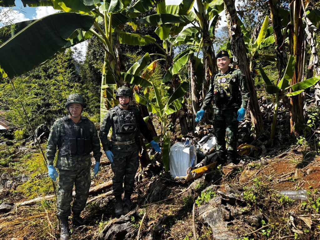 วันที่ 2 มกราคม 2568 เวลา 05.30 น. กองกำลังผาเมือง โดย กองร้อยทหารม้าที่ 2 หน่วยเฉพาะกิจทัพเจ้าตาก จัดกำลังพล จำนวน 2 ชุดปฏิบัติการ ทำการเฝ้าตรวจเพื่อป้องกันและสกัดกั้นการกระทำผิดตาม พระราชบัญญัติให้ใช้ ประมวลกฎหมายยาเสพติด พ.ศ. 2564 บริเวณ บ้านผาหมี หมู่ที่ 6 ตำบลเวียงพางคำ อำเภอแม่สาย จังหวัดเชียงราย ตรวจพบกลุ่มบุคคลต้องสงสัยสะพายกระสอบดัดแปลง ประมาณ 10 – 15 คน จึงได้แสดงตัวเพื่อขอทำการตรวจค้น แต่กลุ่มบุคคลดังกล่าวได้ใช้อาวุธปืนไม่ทราบชนิดและขนาดยิงใส่ฝ่ายเรา ทำให้เกิดการปะทะกันประมาณ 5 นาที เมื่อสิ้นสุดการปะทะ ฝ่ายเราปลอดภัย กลุ่มบุุคคลดังกล่าวได้ทิ้งสิ่งของไว้ และใช้ความชำนาญในพื้นที่หลบหนีไปได้ หน่วยจึงได้จัดกำลังพลเพิ่มเติม จำนวน 2 ชุดปฏิบัติการ เข้าควบคุมพื้นที่เกิดเหตุ ต่อมาเมื่อเวลา 07.00 นาฬิกา หน่วยเข้าดำเนินการตรวจสอบบริเวณพื้นที่เกิดเหตุ ตรวจพบกระสอบดัดแปลง ภายในบรรจุยาเสพติดให้โทษประเภท 1 (ยาบ้า) จำนวน 11 กระสอบๆ ละ 200,000 เม็ด รวมยาบ้าประมาณ 2,200,000 เม็ด