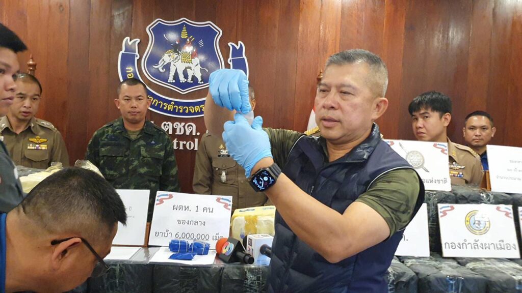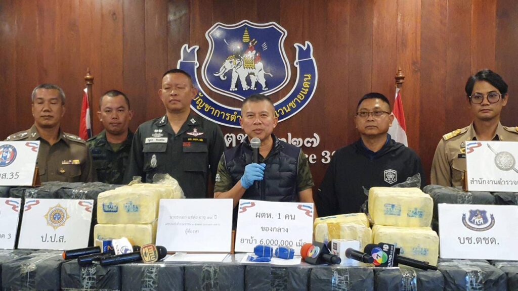 วันที่ 24 มกราคม 2569 เวลา 14.00 น. พล.ต.ท.รุ่งโรจน์ ฐากูรปุณยสิริ ผู้บัญชาการ ตำรวจตระเวนชายแดน พล.ต.ต.ปกปภพ ยดีพิมักษ์ รอง ผบช.ตชด. พล.ต.ต.วรพัฒน์ บุญมา ผบก.ตชด.ภ.3 พล.ต.ต.มานพ เสนากูล ผบก.ภ.จว.เชียงราย พ.ต.อ.รัฐพล น้อยช่างคิด รอง ผบก.ภ.จว.เชียงราย พ.ต.อ.รังสิมันต์ สงเคราะห์ธรรม รอง ผบก.ตชด.ภ.3 ว่าที่ พ.ต.อ.รัฐกร อินทนิล ผกก.ตชด.32 พ.ต.อ.สุทีป แสงนัยยา ผกก.สภ.พญาเม็งราย พ.ต.ท.ขจรพล เดชมี รอง ผกก.ตชด.32 พ.ต.ท.ชวลิต คำตื้อ รอง ผกก.หน.ร้อย ตชด.327 พ.ต.ต.อนัญวัฒน์ รัตนวิชัย ผบ.ร้อย ตชด.344 พ.ต.ต.ธนวัฒน์ ทิพวริ ผบ.ร้อย ตชด.327 พ.ท.มาฆวัฒน์ ทับโทน เสธฯ หน่วยเฉพาะกิจทัพเจ้าตากกองกำลังผาเมือง ฝ่ายปกครอง พร้อมหน่วยงานที่เกี่ยวข้อง ได้ร่วมกันแถลงข่าว การจับกุม นายธงเอก (ขอสงวนนามสกุล) อายุ19 ชาว ต.ตาดควัน อ.พญาเม็งราย จ.เชียงราย พร้อมของกลางยาบ้า จำนวนประมาณ 6,000,000 เม็ด