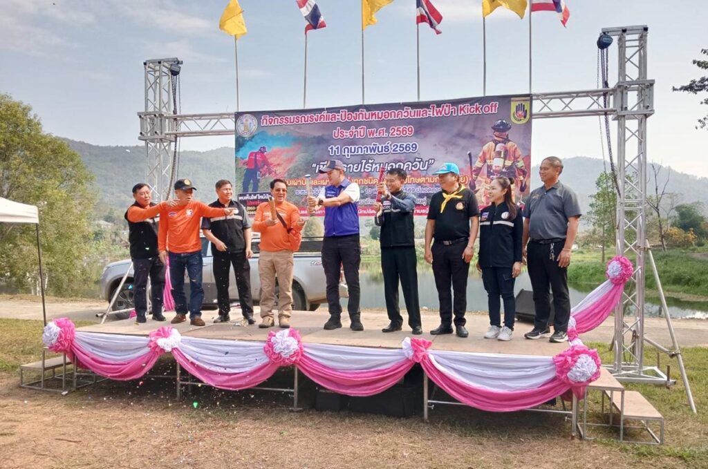 วันที่ 11 กุมภาพันธ์ 2569 ที่ลานข้างประปา หมู่ 13 บ้านหัวฝาย ตำบลบ้านดู่ นายประยงค์ ศิริวัฒน์ ปลัดอำเภอเมืองเชียงราย เป็นประธานเปิดโครงการ โดยมี นายศรีเนตร ธนาคำ นายกเทศมนตรีตำบลบ้านดู่ กล่าวรายงานวัตถุประสงค์ พร้อมผู้นำชุมชน อปพร. จิตอาสา และเครือข่ายป้องกันไฟป่า นำโดยนายวินัย ธุวคำ กำนันตำบลบ้านดู่ เข้าร่วมอย่างพร้อมเพรียง