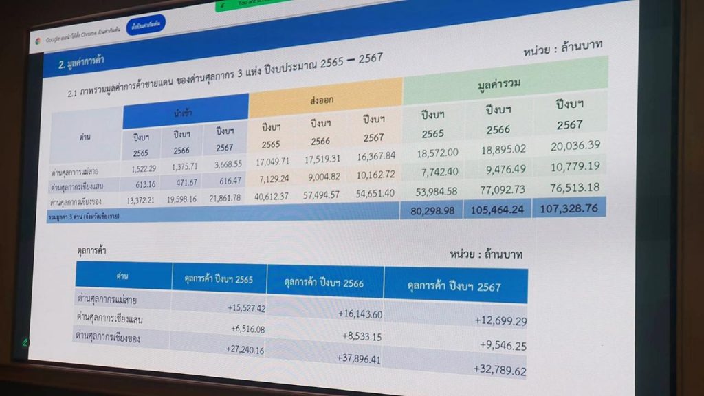 โดยในปี 2567 ด่านศุลกากรแม่สาย มีการส่งออกมูลค่า 16,367.84 ล้านบาท นำเข้ามูลค่า 3,668.55 ล้านาบาท,ด่านศุลกากรเชียงแสน มีการส่งออกมูลค่า 10,162.72 ล้านบาท นำเข้ามูลค่า 616.47 ล้านบาท และด่านศุลกากรเชียงของส่งออกมูลค่า 54,651.40 ล้านบาท และนำเข้ามูลค่า 21,861.78 ล้านบาท ซึ่งทำให้ประเทศไทยได้ดุลการค้าจากทั้ง 3 พรมแดนเป็นมูลค่าจำนวนมาก โดยสินค้าส่งออกส่วนใหญ่เป็นน้ำมันเชื้อเพลิง สินค้าอุปโภคบริโภค ส่วนสินค้านำเข้าส่วนใหญ่เป็นสินค้าทางการเกษตร ถ่านหิน ทั้งนี้มีการรับฟังสภาพปัจจุบันและปัญหาอุปสรรคของด่านพรมแดนต่างๆ โดยเฉพาะใน สปป.ลาว ที่ยังไม่อนุญาตให้มีการใช้รถบรรทุกหนัก 500 ตัน แต่อยู่ระหว่างการประชุมและเจรจาเพื่อให้กลับมาใช้รถบรรทุกหนัก 500 ตันที่ลงทะเบียนไว้จึงต้องรอผลการดำเนินการของ สปป.ลาว ต่อไป