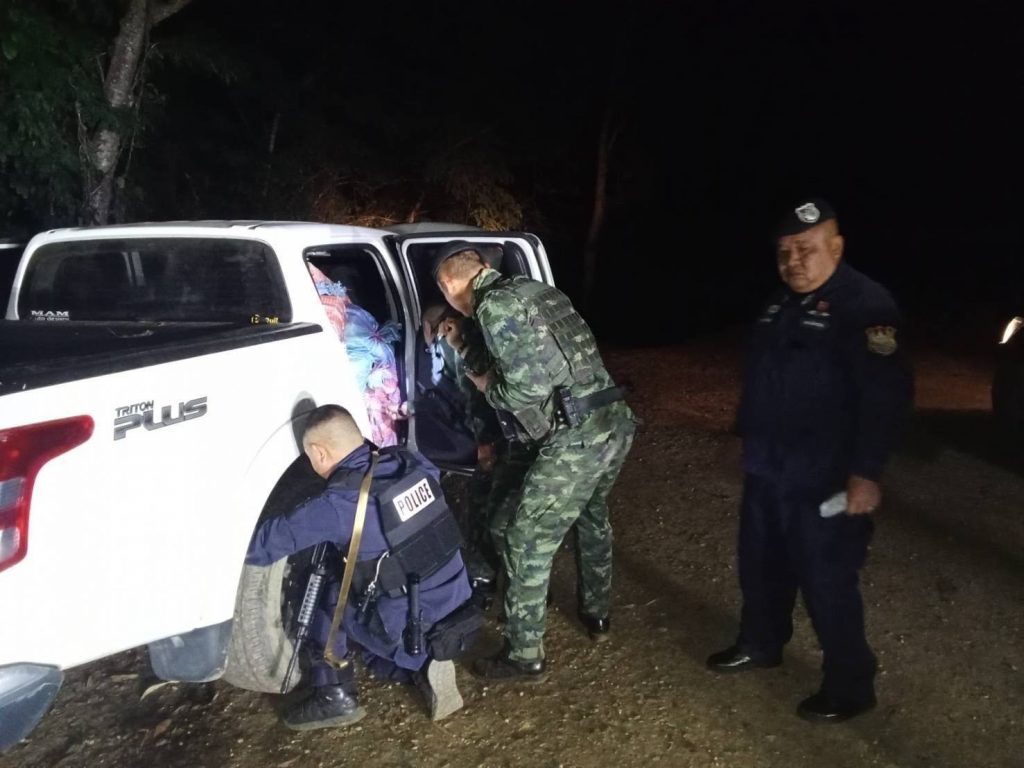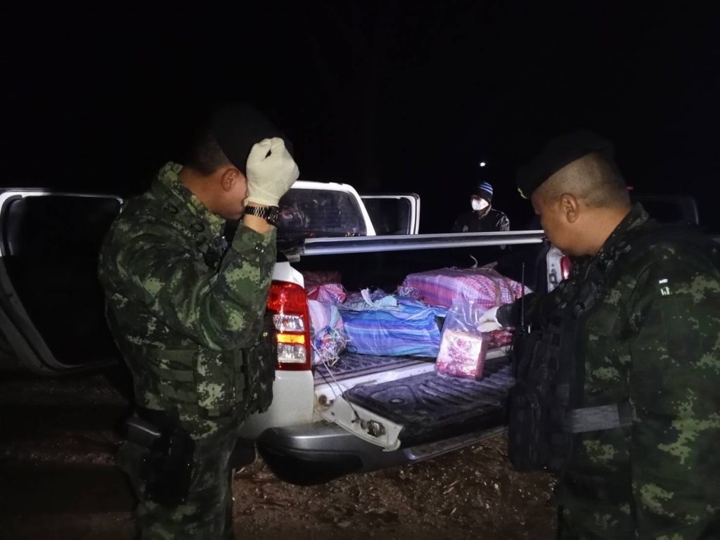 โดยรถยนต์กระบะที่ก่อเหตุได้ขับหลบหนีไปทาง ต.แม่สลองนอก อ.แม่ฟ้าหลวง เจ้าหน้าที่ตำรวจและทหารจึงได้นำรถยนต์ออกไล่ติดตามจนกระทั่งพบรถยนต์กระบะคันดังกล่าวถูกจอดทิ้งเอาไว้ที่ข้างทางที่หมู่บ้านเล่าสิบ หมู่ 3 ต.แม่สลองนอก ในสภาพที่ล้อรถด้านหน้าขวาเสียหายไม่สามารถขับต่อไปได้ แต่ไม่พบคนขับ เจ้าหน้าที่จึงได้เข้าตรวจค้นรถพบทั้งภายในเบาะนั่งหลังและและกระบะหลังรถพบบรรทุกกระสอบฟางสีรุ้งมาด้วยรวมจำนวน 22 ใบ ภายในบรรจุไอซ์เบื้องต้น้ำหนักกระสอบละ 21 กิโลกรัมจำนวน 20 กระสอบ,กระสอบละ 20 กิโลกรัมจำนวน 1 กระสอบ และกระสอบละ 16 กิโลกรัมจำนวน 1 กระสอบ จึงได้ตรวจยึดไว้เป็นของกลางและนำไปชั่งเพื่อหาน้ำหนักอย่างเป็นทางการจากนั้นได้นำกำลังออกติดตามผู้ที่หลบหนีต่อไป