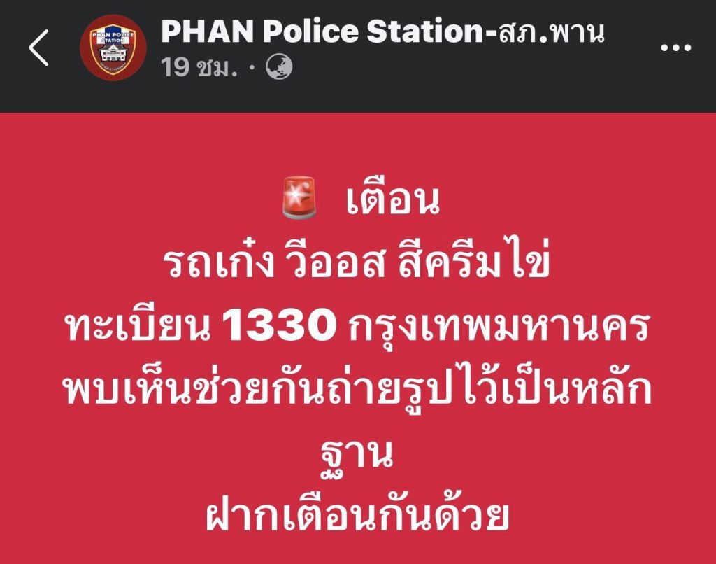 ด้านเพจ PHAN Police Station-สภ.พาน ได้เผยแพร่ข้อความว่า ได้มีรถยนต์เก๋ง ยี่ห้อโตโยต้า รุ่นวีออส สีครีมไข่ ป้ายทะเบียน 1330 กรุงเทพฯ ถ้าประชาชนพบเห็นให้ช่วยกันถ่ายรูปไว้เป็นหลักฐานฝากเตือนกันด้วย พร้อมทั้งแชทตอบในโพสต์เดียวกันว่า “เตือนภัย รถเก๋งสีครีมไข่วีออสทะเบียน 1330 กรุงเทพ ทำทีมาขายผ้าใบเก่า..เห็นเขาว่าเป็นรถจับละอ่อน (เด็ก) ไปขายเมื่อเช้ามาเขตสันขี้เบ้าป่าไผ่.พ่อหลวงเลยลงไปถามดูบ่าคนที่ลงมาขายผ้าใบโดดขึ้นรถขับรถหนีอย่างเร็ว..ถ้าบ่าผิดจะหนีทำไม..ขับรถตามไปหายแซบ.ตอนนี้แจ้งสืบพานไปละ..ท่านไหนเห็นช่วยกันถ่ายรูปไว้เป็นหลักฐานฝากเตือนกันด้วยครับ”