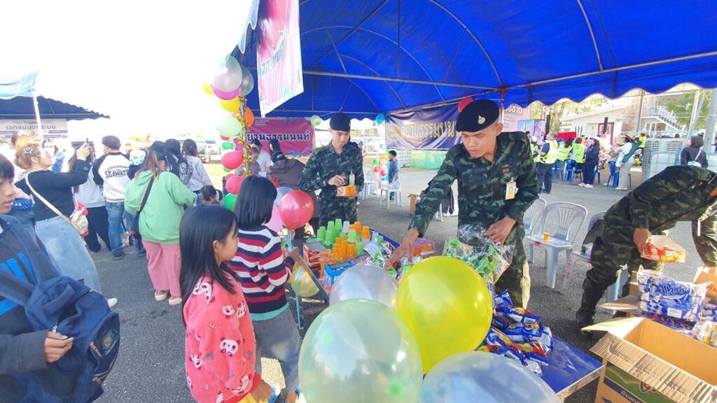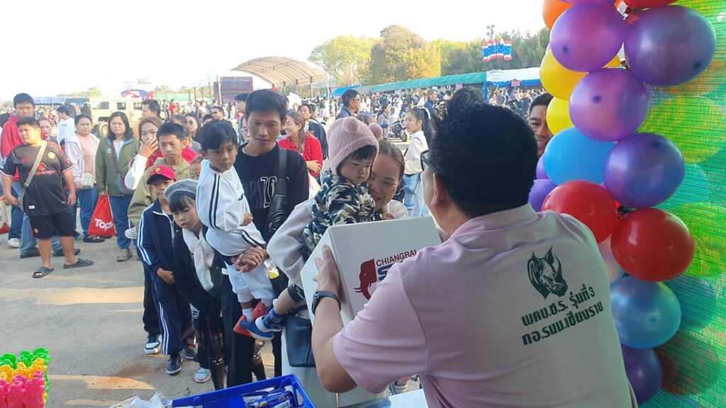 ภายในงานมีการแจกของขวัญ ของเล่น และขนมให้กับเด็ก ๆ ที่มาร่วมกิจกรรมอย่างทั่วถึง ท่ามกลางบรรยากาศสนุกสนานและเป็นกันเอง นอกจากนี้ยังมีการจัดแสดงยุทธปกรณ์ทางทหารจากหน่วยต่าง ๆ อาทิ หน่วยเฉพาะกิจทัพเจ้าตาก กองกำลังผาเมือง หน่วยเรือรักษาความสงบเรียบร้อยตามลำน้ำโขง (นรข.) เขตเชียงราย มณฑลทหารบกที่ 37 และสถานีตำรวจภูธรเมืองเชียงราย สร้างความตื่นตาตื่นใจให้กับเด็กและเยาวชนเป็นอย่างมาก