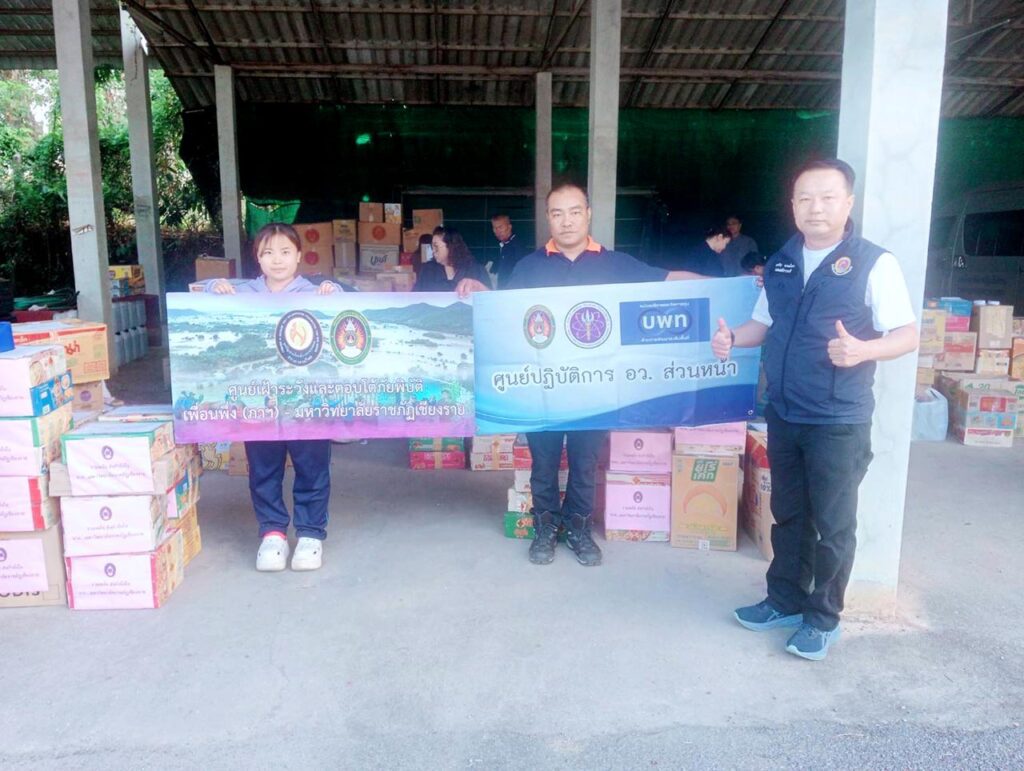 วันที่ 10 ธันวาคม 2568 สำนักกองบริหารกายภาพสิ่งแวดล้อมและความปลอดภัยมหาวิทยาลัยราชภัฏเชียงราย ทางด้าน รศ.ดร.ไพโรจน์ ด้วงนคร อธิการบดีมหาวิทยาลัยราชภัฏเชียงรายพร้อมคณะกรรมการส่งเสริมกิจการมหาวิทยาลัย มูลนิธิอาสาเพื่อนพึ่ง(ภาฯ) ยามยากสภากาชาดไทย มอบหมายให้ รศ.ดร.นาวิน พรมใจสา จิตอาสา4A-393/ก จิตอาสา 904 ผอ.ศูนย์เฝ้าระวังและตอบโต้ภัยพิบัติเพื่อนพึ่ง(ภาฯ)ราชภัฏเชียงราย พร้อมด้วย ผอ.ราชันทนันชัย ผู้อำนวยการกองทัพสิ่งแวดล้อมและความปลอดภัย พร้อมด้วยภาคีเครือข่ายได้แก่ อว.ส่วนหน้า /บพท. /กองบิน 416 เชียงราย ศูนย์การจัดการภัยพิบัติบ้านดู่ บริษัทสมบัติทัวร์จำกัดเชียงราย