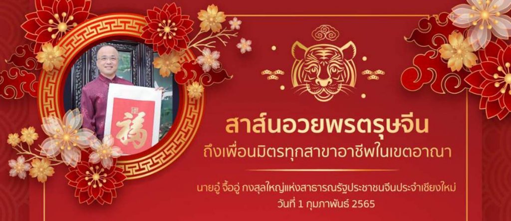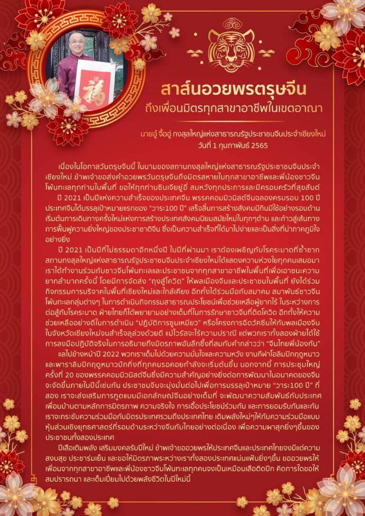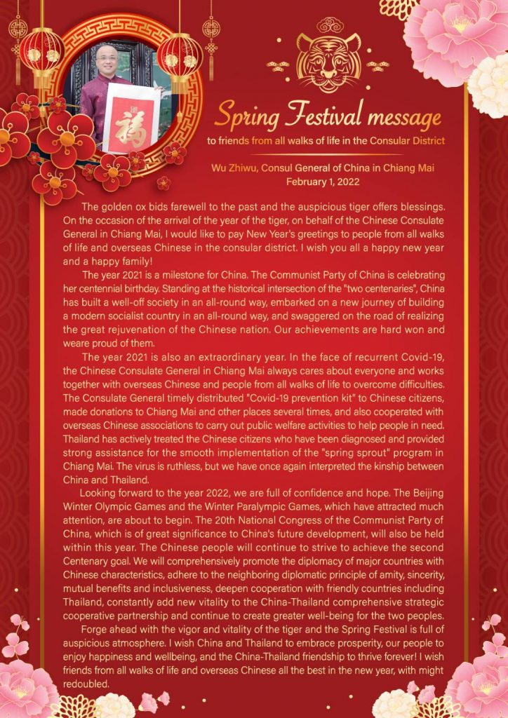 The golden ox bids farewell to the past and the auspicious tiger offers blessings. On the occasion of the arrival of the year of the tiger, on behalf of the Chinese Consulate General in Chiang Mai, I would like to pay New Year’s greetings to people from all walks of life and overseas Chinese in the consular district. I wish you all a happy new year and a happy family!
