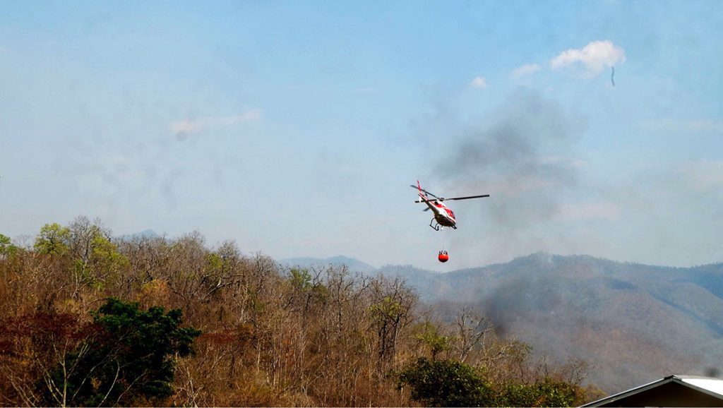 ฮ.กระทรวงทรัพยากรฯ บินดับไฟป่า ท้องที่อำเภอแม่สะเรียง สถานการณ์ไฟป่าแม่ฮ่องสอน พบพื้นที่เกิดไฟกระจาย ทุกอำเภอ ค่ามลพิษของแม่ฮ่องสอน พุ่ง 146 ไมโครกรัมต่อลูกบาศก์เมตร สูงสุดในห้วงปีนี้ ขณะที่ค่ามลพิษเกินมาตรฐานต่อเนื่อง 20 วัน ภายหลังจากที่สถานการณ์หมอกควันและไฟป่าส่อเค้าทวีความรุนแรงขึ้น โดยพบจุดความร้อนกระจายในทุกอำเภอ โดยเฉพาะในพื้นที่ อ.แม่สะเรียง และ อำเภอเมือง จ.แม่ฮ่องสอน