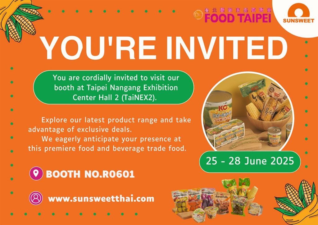 บริษัท ซันสวีท จำกัด (มหาชน) (SUN) ผู้นำด้านการผลิตและส่งออกข้าวโพดหวานแปรรูปและผลิตภัณฑ์อาหารพร้อมรับประทาน เข้าร่วมจัดแสดงสินค้าในงาน FOOD TAIPEI MEGA SHOWS 2025 ซึ่งจัดขึ้นระหว่างวันที่ 25–28 มิถุนายน 2568 บูธหมายเลข R0601 Hall 2 ณ ศูนย์แสดงสินค้านานาชาติไทเป หนานกัง ประเทศไต้หวัน