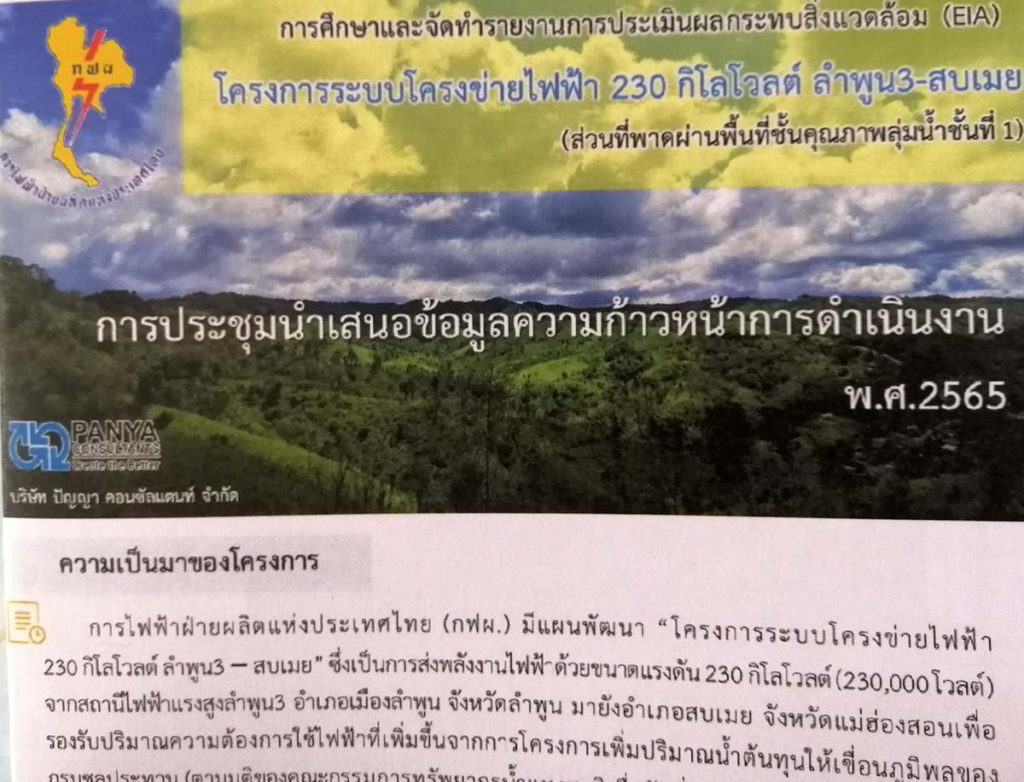 ทั้งนี้ โครงการดังกล่าวเป็นการก่อสร้างระบบโครงข่ายไฟฟ้าวงจรคู่ แรงดันไฟฟ้าขนาด 230 กิโลโวลต์ เชื่อมโยงจากสถานีไฟฟ้าแรงสูงลำพูน 3 อำเภอเมืองลำพูน จังหวัดลำพูน ไปยังสถานีไฟฟ้าแรงสูงสบเมย อำเภอสบเมย จังหวัดแม่ฮ่องสอน มีความกว้างของเขตระบบโครงข่ายสายส่งไฟฟ้า (Right of way) 40 เมตร (ข้างละ 20 เมตรจากศูนย์กลางแนวเสาส่งไฟฟ้า) ระยะทางรวมประมาณ 147.07 กิโลเมตร มีส่วนที่พาดผ่านพื้นที่ชั้นคุณภาพลุ่มน้ำที่ 1 เป็นระยะทาง 27.45 กิโลเมตร เพื่อรองรับปริมาณความต้องการใช้ไฟฟ้าที่เพิ่มขึ้น สนับสนุนโครงการเพิ่มปริมาณน้ำต้นทุนให้เขื่อนภูมิพล และสร้างความมั่นคงด้านพลังงานไฟฟ้าให้กับประชาชนในพื้นที่จังหวัดแม่ฮ่องสอนและจังหวัดเชียงใหม่