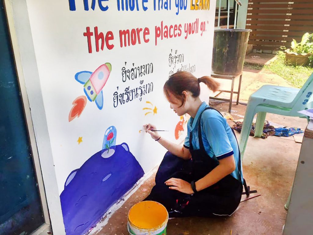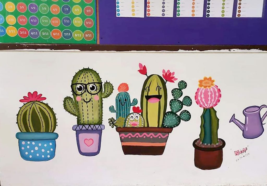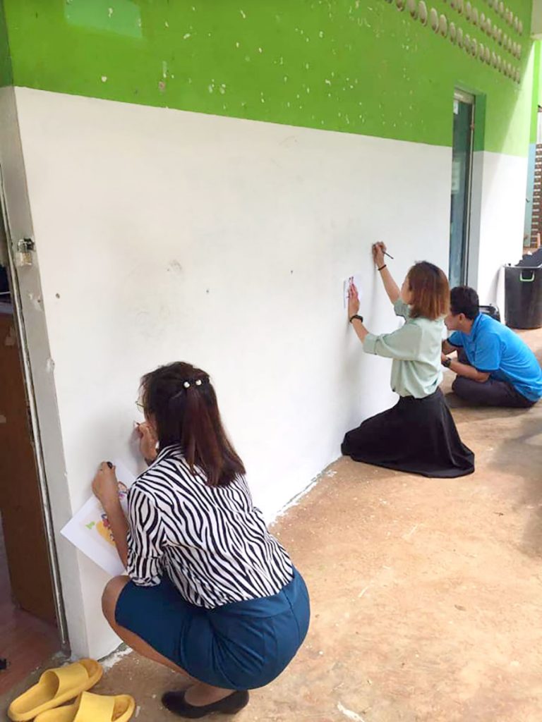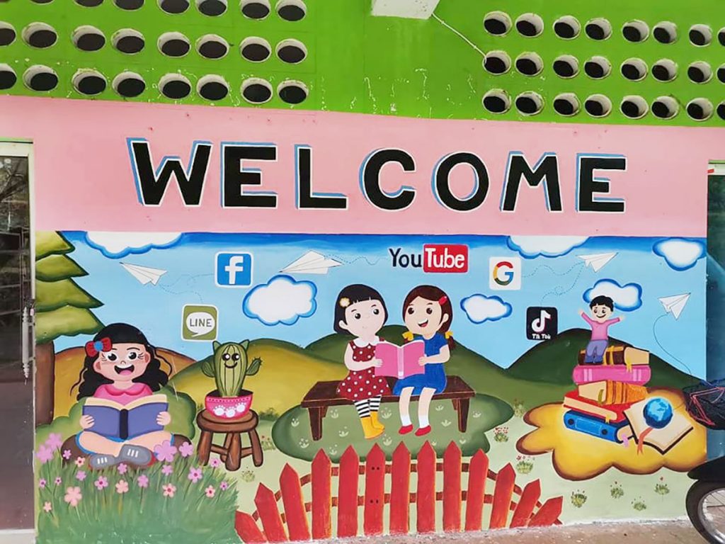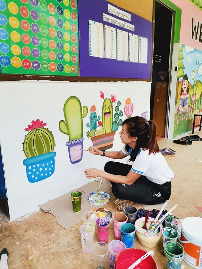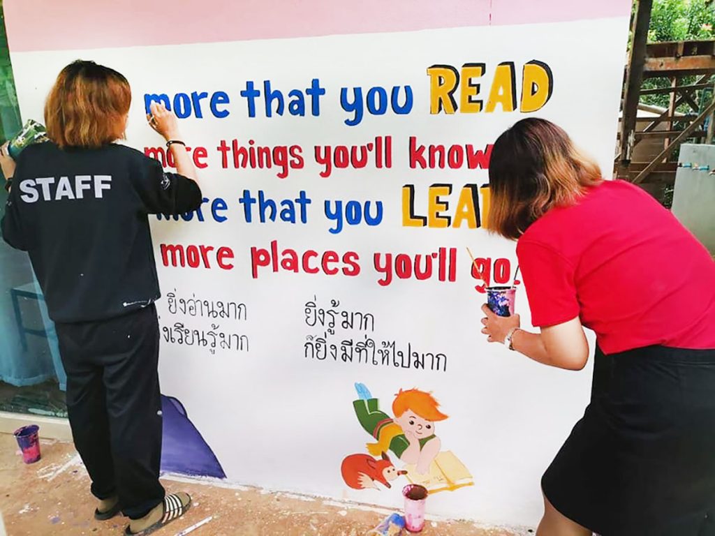 คุณครูโรงเรียนบ้านแม่จ๊างร่วมสร้างสีสันการเรียนรู้ให้เด็กนักเรียน ใช้เวลาหลังเลิกเรียนวาดผนังห้องสมุดสร้างแรงจูงใจเข้าสู่แหล่งข้อมูลคลังสมองของโรงเรียน