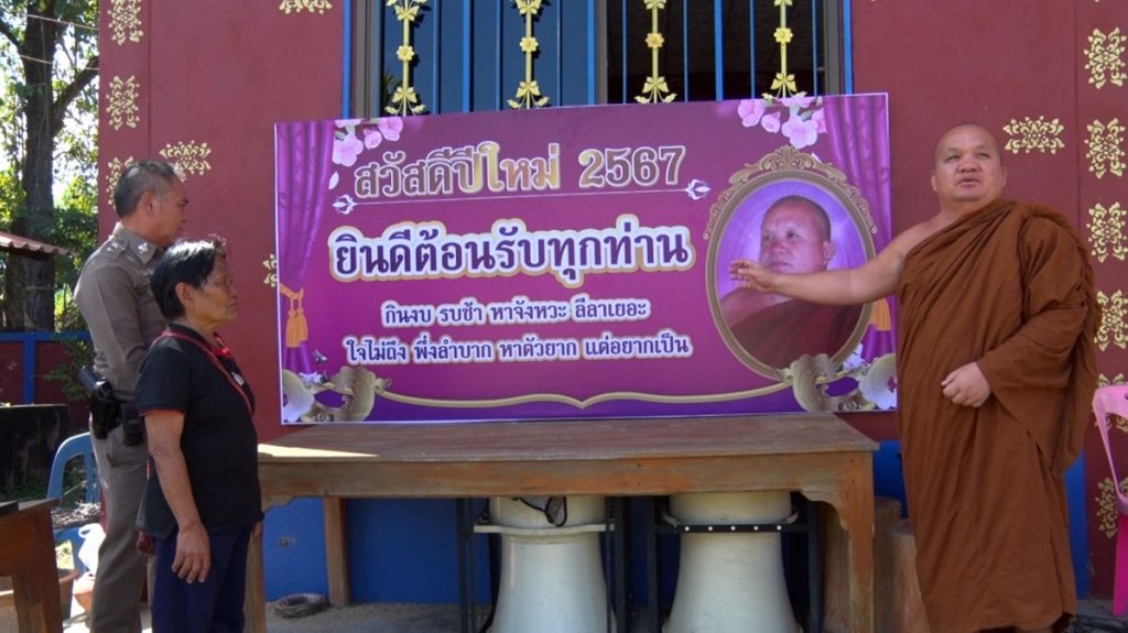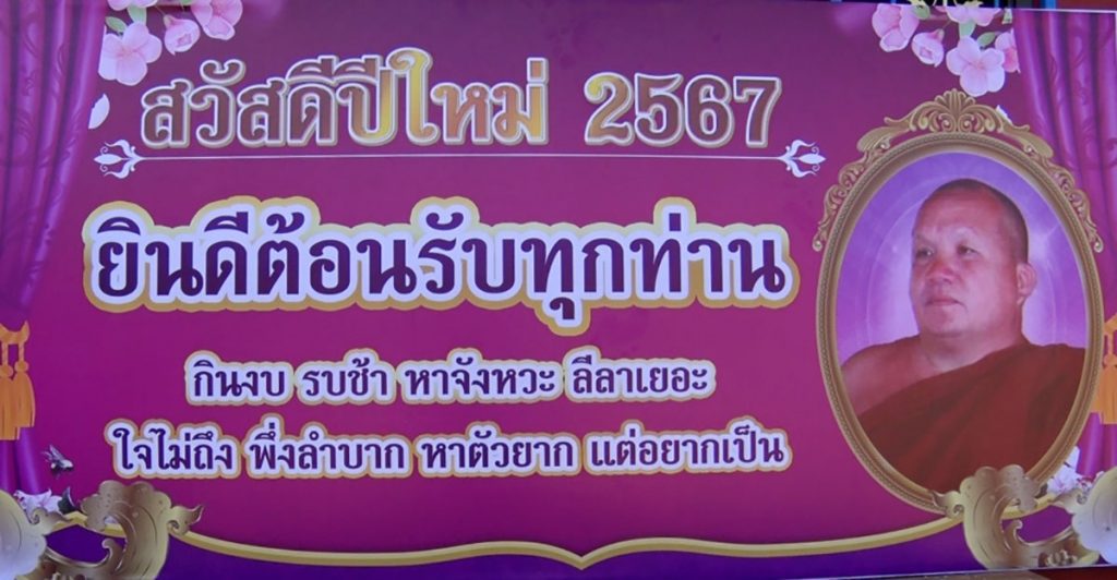 พระฐาปนพงศ์ พรมสวัสดิ์ อายุ 45 ปี เจ้าอาวาสวัดเด่นเหม้า ต. แม่ลาน อ.ลี้ จ.ลำพูน หรือพระขุนเดช พรมสวัสดิ์ ได้ทำแผ่น สคส ขนาด1.5 เมตร คูณ 2.5 เมตร ติดไว้หน้ากุฎิ ภายในวัด เขียนข้อความระบุว่า สวัสดีปีใหม่ 2567 ยินดีต้อนรับทุกท่าน และข้อความที่สะดุดตาที่สุด ที่ระบุว่า กินงบ รบช้า หาจังหวะ ลีลาเยอะ,ใจไม่ถึง พึ่งลำบาก หาตัวยาก แต่อยากเป็น