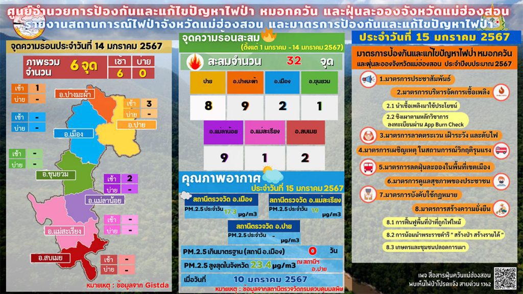 สำหรับสถานการณ์ไฟป่า จุดความร้อนสะสมตั้งแต่ วันที่ 1 มกราคม – 14 มกราคม 2567 จังหวัดแม่ฮ่องสอน มีจุดความร้อนสะสมทั้งหมด 32 จุด คิดเป็นร้อยละ 0.28 ของจุดความร้อนสะสมปี 2566 หรือ คิดเป็นร้อยละ 0.46 ของค่าเป้าหมายปี 2567 ซึ่งทางจังหวัดตั้งเป้าหมายปี 2567 ไม่เกิน 5,761 จุด โดยอำเภอที่มีจุดความร้อนสูงสุด ได้แก่ อำเภอปางมะผ้า และอำเภอแม่ลาน้อย จำนวน 9 จุด