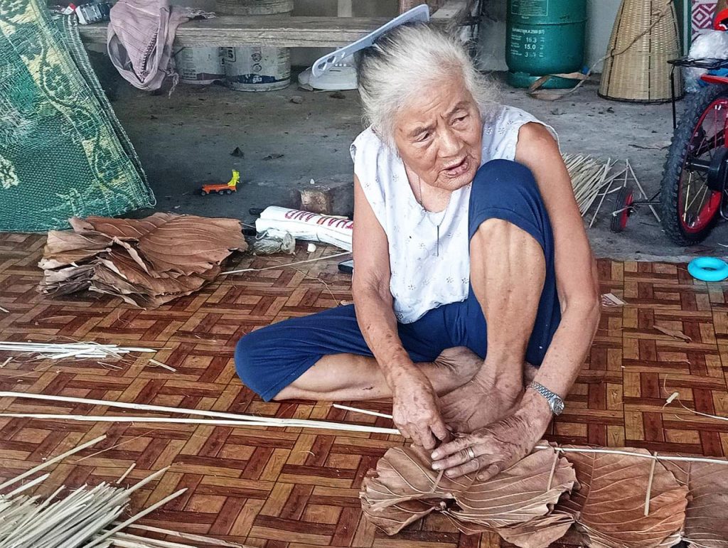 เช่นเดียวกับ นางมือ เลิศรัตนดารา หรือ ยายหอย อายุ 63 ปี เป็นผู้สูงอายุ อีกหนึ่งคนของบ้านโป่งดอยช้าง ต.บ้านกาศ อ.แม่สะเรียง จ.แม่ฮ่องสอน ที่ใช้เวลาว่างในแต่ละวันออกหาใบตองตึง มาไพขาย โดยจะออกจากบ้านประมาณ 06.00 น.เช้า ไปเก็บใบตองตึงในป่าใกล้บ้านรวบรวมใส่ก๋วยกลับบ้าน ซึ่งก่อนจะทำการไพต้องชุบน้ำไม่ให้ตองแห้งเกิน แล้วทำการนั่งไพตองในช่วงบ่ายๆ คุณยายต้องเตรียมตอก และ ไม้ดุ้งก้านหรือก้านไม่ไผ่ที่จะพับตองตึงซ้อนกันมัดด้วยตอกเป็นแผ่น ซึ่งเป็นภูมิปัญญาที่สืบทอดกันมาตั้งแต่บรรพบุรุษ ที่สามารถสร้างงาน สร้างรายได้ มากน้อยขึ้นอยู่กับความขยัน สำหรับ ยายหอย ในห้วงนี้ก็จะอยู่บ้านไพตอง แต่ละวันได้ประมาณสิบยี่สิบไพ สะสมไปเรื่อยๆ ฤดูกาลหนึ่งก็จะได้ตองตึงไพประมาณ 300-400 ไพ เพราะเก็บใบไม้เฉพาะใกล้ๆบ้าน ซึ่งยายหอยทำเองหมด ทั้งการเก็บตอง จักตอก ทำไม้ดุ้งก้าน โดยอาศัยใช้เวลาว่างในแต่ละวันให้เกิดประโยชน์ซึ่งหนึ่งปีก็ไพตองขาย 1 ครั้ง ได้เงินมาใช้จ่าย