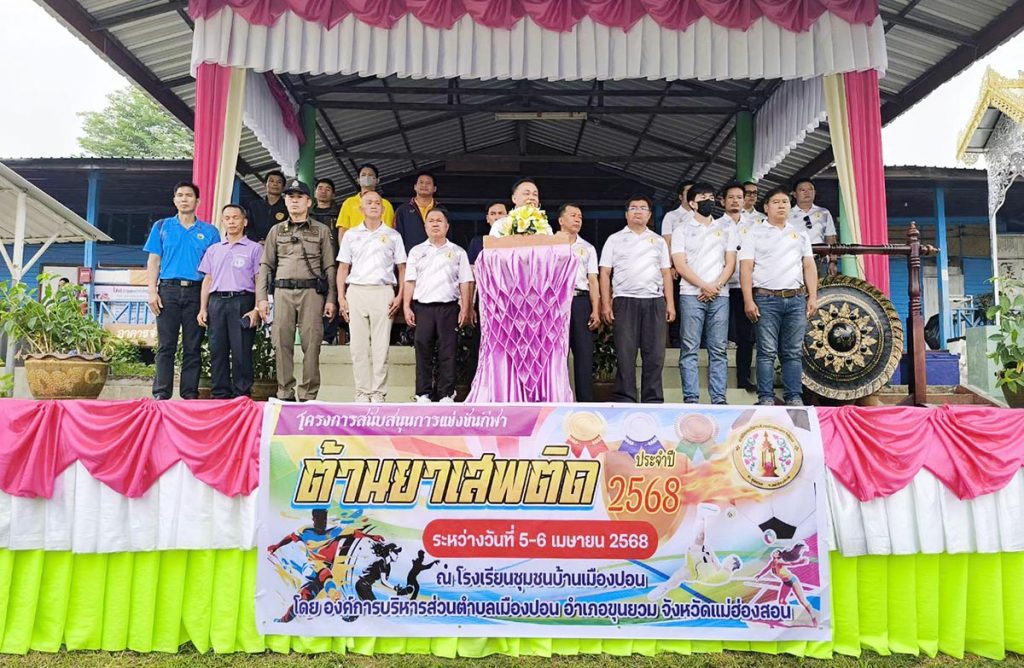 วันที่ 6 เมษายน 2568 นายณรงค์พัชญ์ นาคทรัพย์ นายอำเภอขุนยวม จ.แม่ฮ่องสอน ได้เดินทางไปเป็นประธานในพิธีเปิดการแข่งขันกีฬาต่อต้านยาเสพติด ณ โรงเรียนชุมชนบ้านเมืองปอน หมู่ 1 ต.เมืองปอน อ.ขุนยวม จ.แม่ฮ่องสอน โดยมี นายชาคร กันตีมูล นายกองค์การบริหารส่วนตำบลเมืองปอน เป็นผู้กล่าวถึงวัตถุประสงค์ของการจัดงานดังกล่าว โดยกล่าวว่าการจัดแข่งขันกีฬาดังกล่าวก็เพื่อ เพื่อให้เยาวชนและประชาชนในแต่ละหมู่บ้าน หันมาออกกำลังกายและเล่นกีฬา เพื่อให้สุขภาพร่างกายแข็งแรง และให้ห่างไกลจากยาเสพติด ซึ่งนักกีฬาจะได้แสดงความสามารถ ทักษะทางด้านการเล่นกีฬา และนำประสบการณ์การแข่งขันไปพัฒนาทักษะจากขั้นพื้นฐานสู่ความเป็นเลิศ โดยใช้กีฬาเป็นสื่อในการพัฒนาภาพชีวิต และเป็นการเชื่อมความสันพันธ์ระหว่างหมู่บ้านในพื้นที่ตำบลเมืองปอน ให้มีความรักสามัคคีแก่กันและกัน