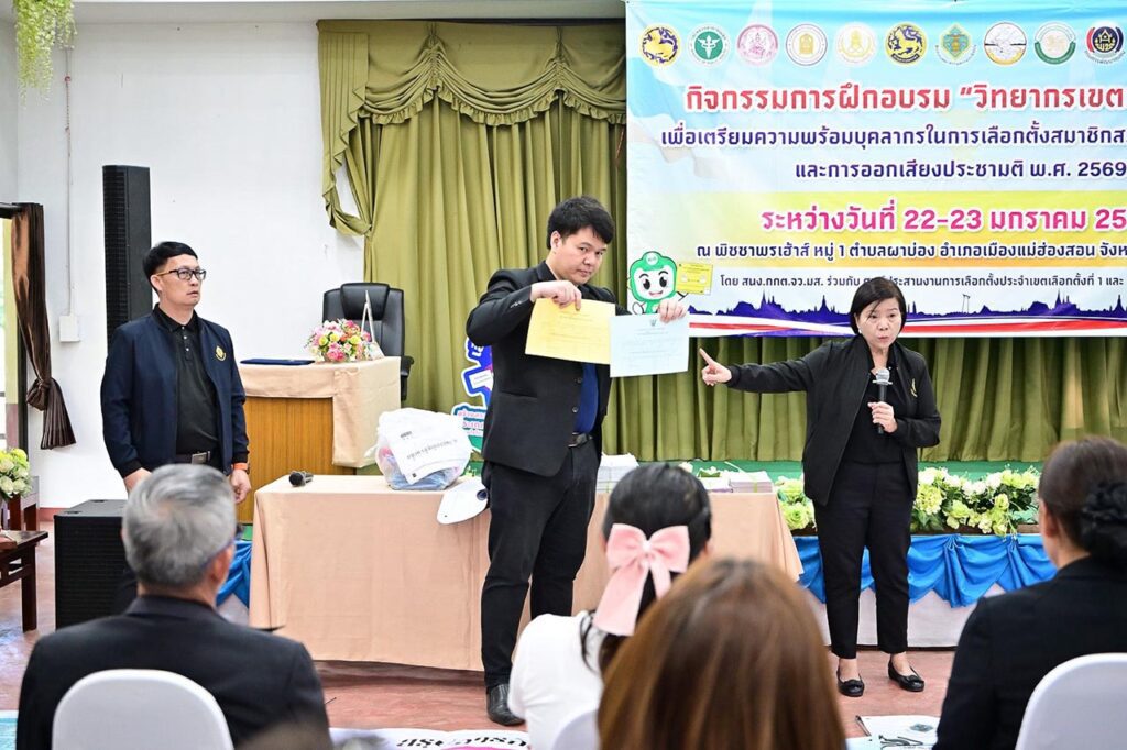 นายณัฐเศรษฐ์ ราชไชยยา ผู้อำนวยการสำนักงานคณะกรรมการการเลือกตั้งประจำจังหวัดแม่ฮ่องสอน เปิดเผยว่า การอบรมในครั้งนี้ เป็นการติวเข้มให้กับวิทยากรเขตเลือกตั้งเป็นเวลา 2 วัน (ระหว่างวันที่ 22-23 มกราคม 2569) ติวเข้มทั้งในเรื่องความรู้เกี่ยวกับ กฎหมาย ระเบียบ ความรู้ในการปฏิบัติหน้าที่และการใช้อำนาจเกี่ยวกับการเลือกตั้ง สส.และการออกเสียงประชามติ การฝึกปฏิบัติหน้าที่ของเจ้าพนักงานผู้ดำเนินการเลือกตั้ง ผ่านฐานการเรียนรู้ 4 ฐานได้แก่ ฐานที่ 1 การปฏิบัติงานก่อนวันเลือกตั้งและก่อนวันออกเสียงประชามติ ฐานที่ 2 การออกเสียงลงคะแนนในวันเลือกตั้ง และก่อนวันออกเสียงเลือกตั้งประชามติ ฐานที่ 3 การนับคะแนนและการรายงานผลคะแนน ฐานที่ 4 การดำเนินการภายหลังการนับคะแนนและการตรวจสอบแบบพิมพ์ เพื่อเตรียมความพร้อมบุคคลากรในการเลือกตั้งสมาชิกสภาผู้แทนราษฎรและการออกเสียงประชามติ พ.ศ.2569 ในวันอาทิตย์ที่ 8 กุมภาพันธ์ 2569 นี้ โดยคาดหวังจำนวนผู้มาใช้สิทธิเลือกตั้งให้มากที่สุด