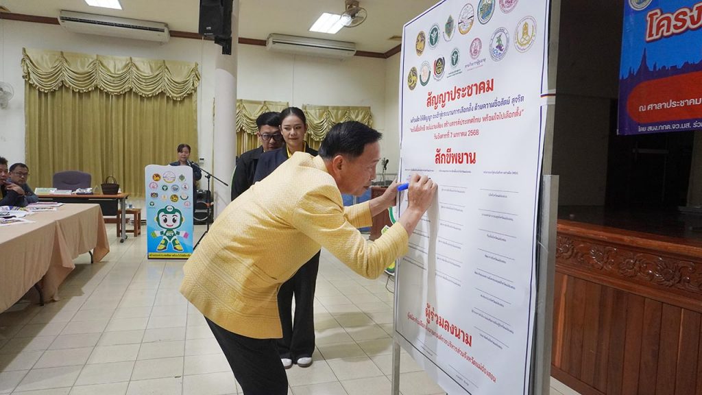 ทั้งนี้ นายบุญลือ ธรรมธรานุรักษ์ รองผู้ว่าราชการจังหวัดแม่ฮ่องสอน ได้ร่วมลงนามในสัญญาประชาคม กิจกรรมเสริมสร้างความรู้ความเข้าใจที่ถูกต้องเกี่ยวกับการเลือกตั้งเชิงสมานฉันท์ ในการเลือกตั้งนายกองค์การบริหารส่วนจังหวัดแม่ฮ่องสอน และสมาชิกสภาองค์การบริหารส่วนจังหวัด ฯ และ ตามโครงการปฏิรูปการเมืองสุจริตบนฐานของการเลือกตั้ง เพื่อให้ความรู้และสร้างความเข้าใจที่ถูกต้องเกี่ยวกับกฎหมาย ระเบียบ ปฏิบัติในการเลือกตั้งแก่ผู้ที่สนใจจะสมัครรับเลือกตั้ง และผู้ที่เกี่ยวข้อง อีกทั้งสร้างการยอมรับเรื่องการรู้แพ้ รู้ชนะ รู้อภัย รู้รักสามัคคี การรักษาความเป็นมิตร ก่อนและหลังการเลือกตั้ง แก่ผู้สมัครรับเลือกตั้งเพื่อให้การหาเสียง เลือกตั้ง เป็นไปอย่างโปร่งใส ไม่กระทำผิดกฎหมายเลือกตั้ง ไม่มีการซื้อสิทธิ ขายเสียงและใส่ร้ายป้ายสีซึ่งกันและกัน
