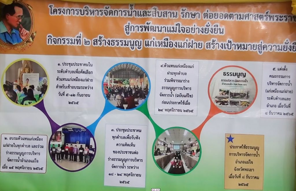 โดยอำเภอแม่ใจได้มีประกาศอำเภอแม่ใจ เรื่อง แต่งตั้งคณะอำนวยการและคณะทำงานภายใต้โครงการอำเภอนำร่อง “บำบัดทุกข์ บำรุงสุข” โครงการ การบริหารจัดการน้ำ และสืบสาน รักษา ต่อยอด ตามศาสตร์พระราชา สู่การพัฒนาแม่ใจอย่างยั่งยืน ปัจจุบันอำเภอแม่ใจ ได้ประกาศใช้ธรรมนูญการบริหารจัดการน้ำอำเภอแม่ใจ จังหวัดพะเยา และแต่งตั้ง คณะกรรมการบริหารจัดการน้ำ (แก่เหมือง แก่ฝาย) เรียบร้อยแล้ว