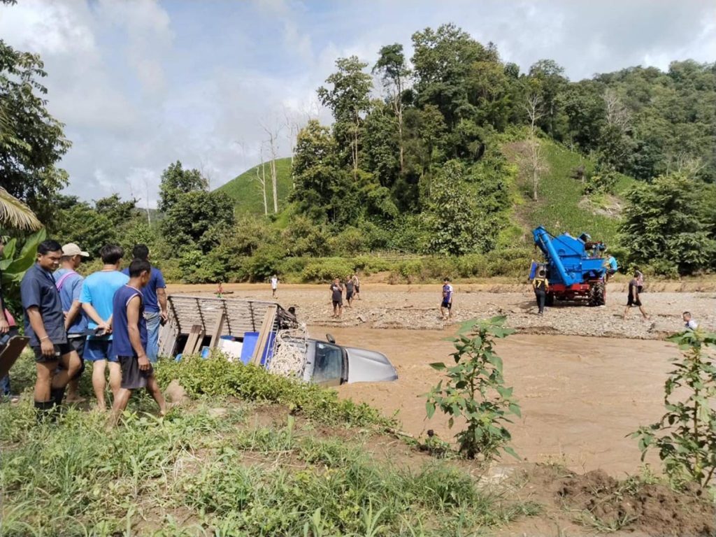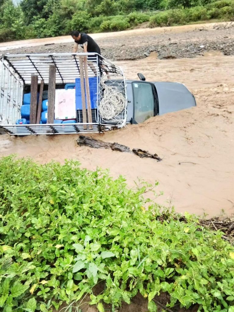 อำเภอแม่สะเรียง แจ้งเตือนเฝ้าระวังน้ำป่าไหลหลาก หลัง รถยนต์วิ่งข้ามลำห้วยแม่แงะ ท่าแม่เจ ถูกน้ำป่าพัด เดชะบุญชาวบ้านช่วยกันทัน