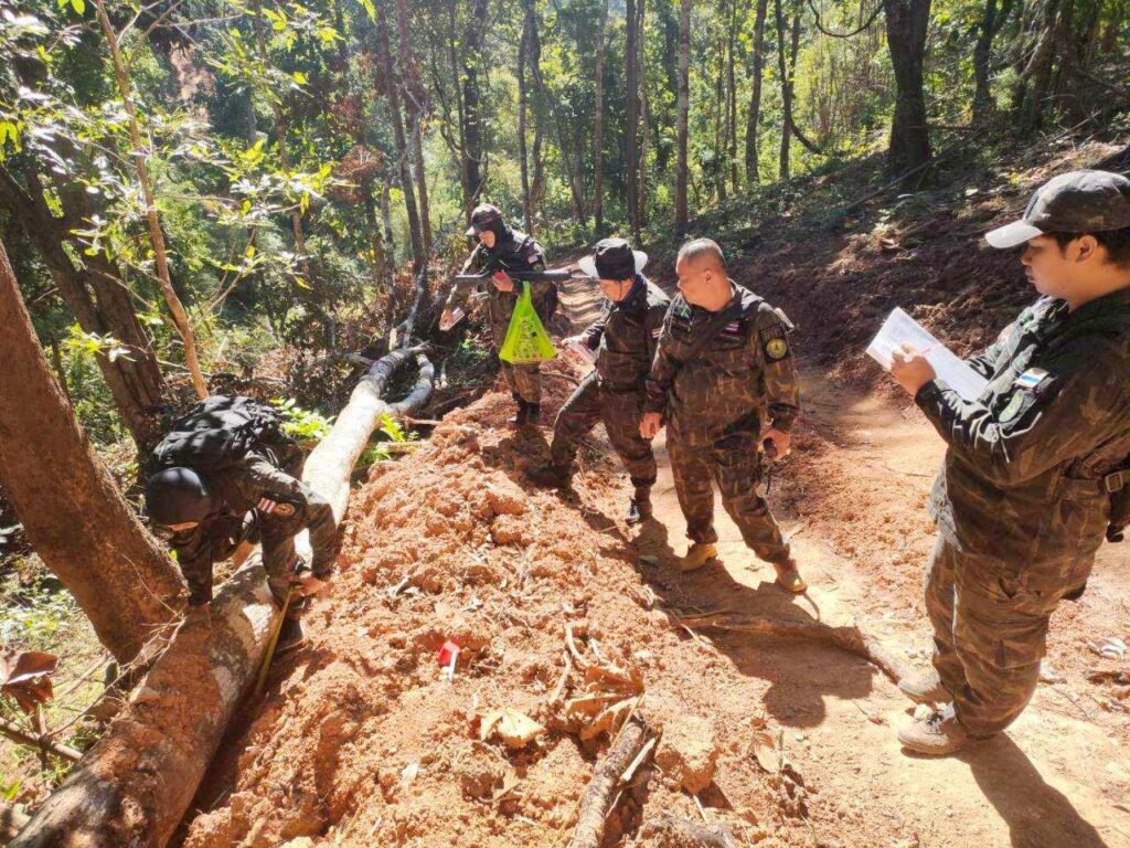 จากการลงพื้นที่สืบทราบข้อมูลเบื้องต้นจากชาวบ้านและผู้ใหญ่บ้านหมู่บ้านห้วยกองเป๊าะ ได้ข้อมูลว่าพบว่า มีการทำถนนดังกล่าวเริ่มดำเนินการมาตั้งแต่ช่วงวันที่ 20 กันยายน 2568 และมีการพูดถึงประเด็นนี้ในการประชุมผู้ใหญ่บ้านเมื่อวันที่ 24 กันยายน 2568 โดยข้อมูลในทางลับปรากฏพฤติการณ์ที่น่าเชื่อว่า มีผู้ใหญ่บ้านในพื้นที่ใกล้เคียงกับหมู่บ้านห้วยกองเป๊าะ เป็นเจ้าของเครื่องจักร ทั้งรถแบคโฮและรถไถฟาร์ม รวมถึงเป็นผู้รับเหมาขุดเจาะถนนเส้นนี้เพื่อใช้สำหรับขนส่งสินค้าเกษตรไม่ทราบประเภทจากประเทศเมียนมาเข้ามายังประเทศไทย