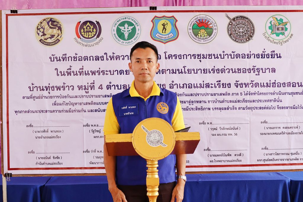 วันที่ 10 มิถุนายน 2567 ที่ศาลาประชาคมบ้านทุ่งพร้าว อำเภอแม่สะเรียง จังหวัดแม่ฮ่องสอน นายวรศักดิ์ พานทอง นายอำเภอแม่สะเรียง เป็นประธานพิธีเปิดโครงการชุมชนบำบัดอย่างยั่งยืนในพื้นที่แพร่ระบาดยาเสพติด ตามนโยบายเร่งด่วนของรัฐบาล ของสถานีตำรวจภูธรแม่สะเรียง โดยมี หัวหน้าส่วนราชการ ผู้บริหารองค์กรปกครองส่วนท้องถิ่น กำนัน ผู้ใหญ่บ้าน องค์กรภาคเอกชน และเครือข่ายภาคประชาชนร่วมลงนามบันทึกข้อตกลงความร่วมมือ (MOU) ตามโครงการชุมชนบำบัดอย่างยั่งยืน ในพื้นที่แพร่ระบาดยาเสพติด ตามนโยบายเร่งด่วนของรัฐบาล