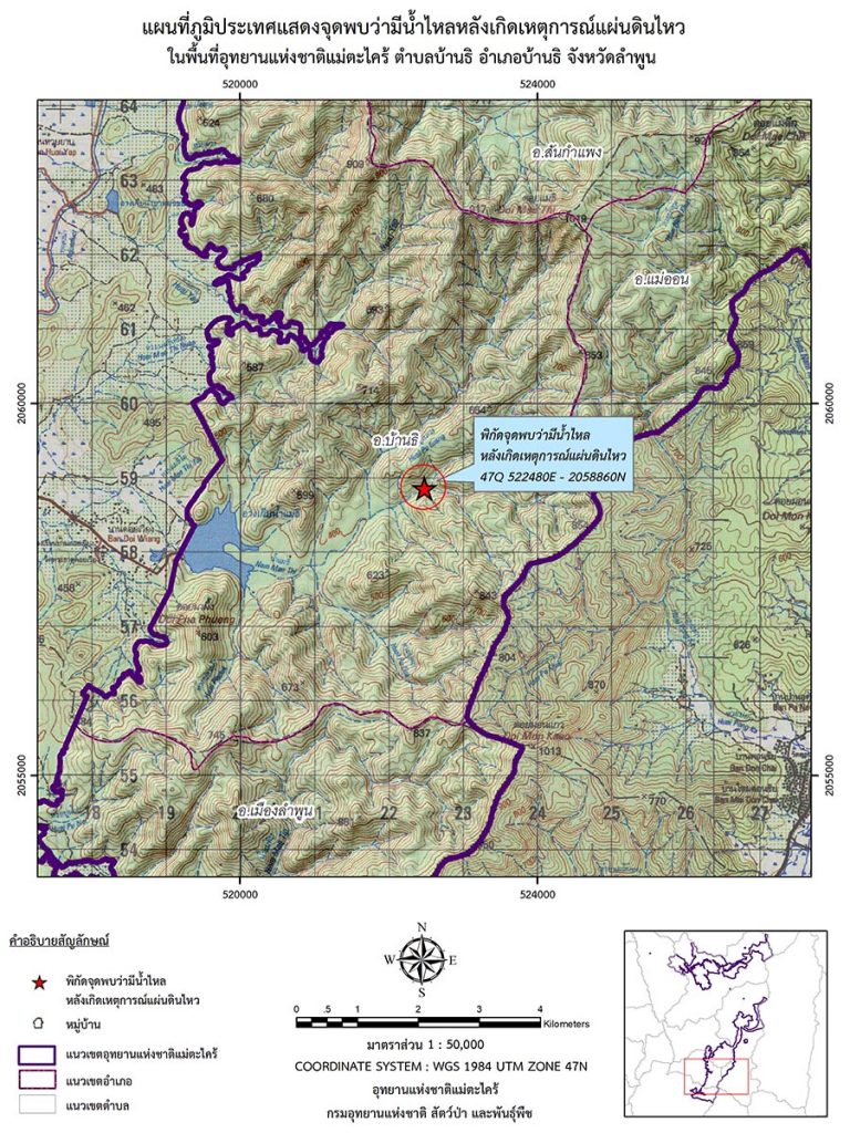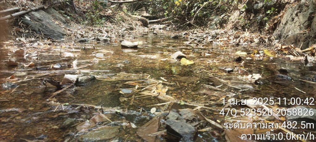 วันที่ 2 เม.ย. 68 นายกริชสยาม คงสตรี ผู้อำนวยการสำนักบริหารพื้นที่อนุรักษ์ที่ 16 กล่าวว่า ได้รับรายงานจาก นายกันย์ จำนงค์ภักดี หัวหน้าอุทยานแห่งชาติแม่ตะไคร้ ถึงข้อเท็จจริงเบื้องต้น จากเหตุการณ์ดังกล่าวว่า เมื่อวันที่ 30 มีนาคม 2568 จนท.ประจำจุดเฝ้าระวังไฟป่าที่ มค.22 (ดอยเวียง) พร้อมด้วย ทสม.บ้านธิ ได้ร่วมกันลาดตระเวนไฟป่าตามปกติ ที่บริเวณเส้นทางอ่างแม่ธิ – น้ำตกห้วยหก พบว่าบริเวณจุดพักแรมชั่วคราว ริมลำห้วยน้ำตกห้วยหก พิักัด 47Q 522480 UTM 2058860 ท้องที่ตำบลบ้านธิ อำเภอบ้านธิ จังหวัดลำพูน เขตอุทยานแห่งชาติแม่ตะไคร้ มีน้ำไหลในลำห้วย ซึ่งปกติจะแล้งในช่วงฤดูแล้ง (ธันวาคม – พฤษภาคม) และจะมีน้ำไหลเฉพาะช่วงฤดูน้ำหลาก สันนิษฐานว่าอาจจะเกิดจากผลกระทบภายหลังเหตุการณ์แผ่นดินไหวดังกล่าว โดยอุทยานแห่งชาติแม่ตะไคร้ได้รับทราบเหตุการณ์ดังกล่าวผ่านกลุ่มไลน์ “หมอกควันไฟป่าบ้านธิ“ ซึ่งข่าวดังกล่าวได้แพร่หลายออกไป ทำให้เป็นที่สนใจในวงกว้าง