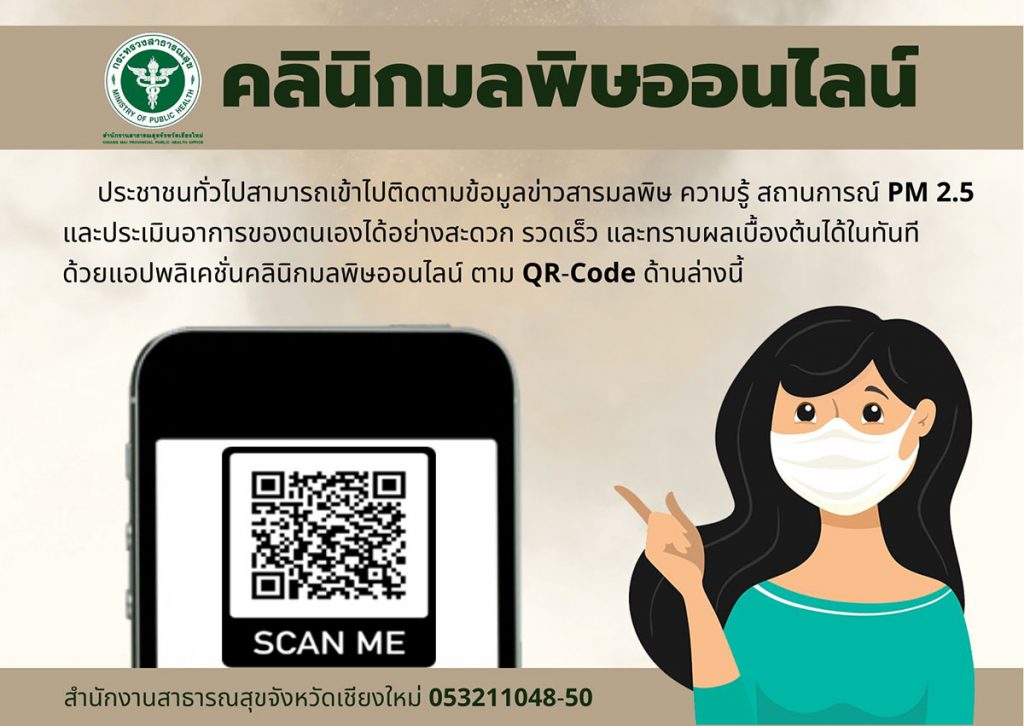 ทั้งนี้ประชาชนสามารถรับการประเมินอาการเบื้องต้นจากการได้รับผลกระทบจากหมอกควัน หรือเข้าไปศึกษาข้อมูลความรู้ การปฎิบัติตัวเพื่อป้องกันผลกระทบต่อสุขภาพจากฝุ่นละอองขนาดไม่เกิน 2.5 PM ผ่านทางคิวอาร์โค้ด