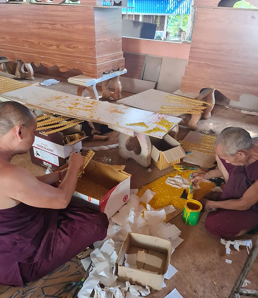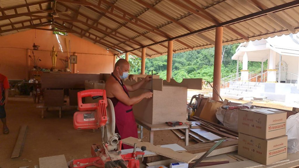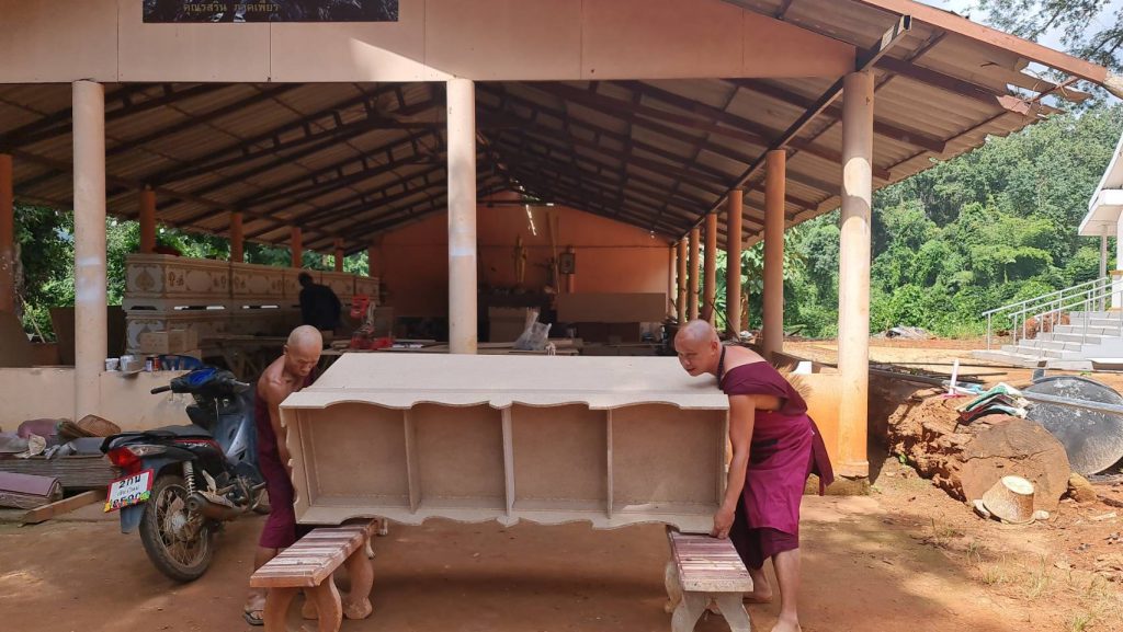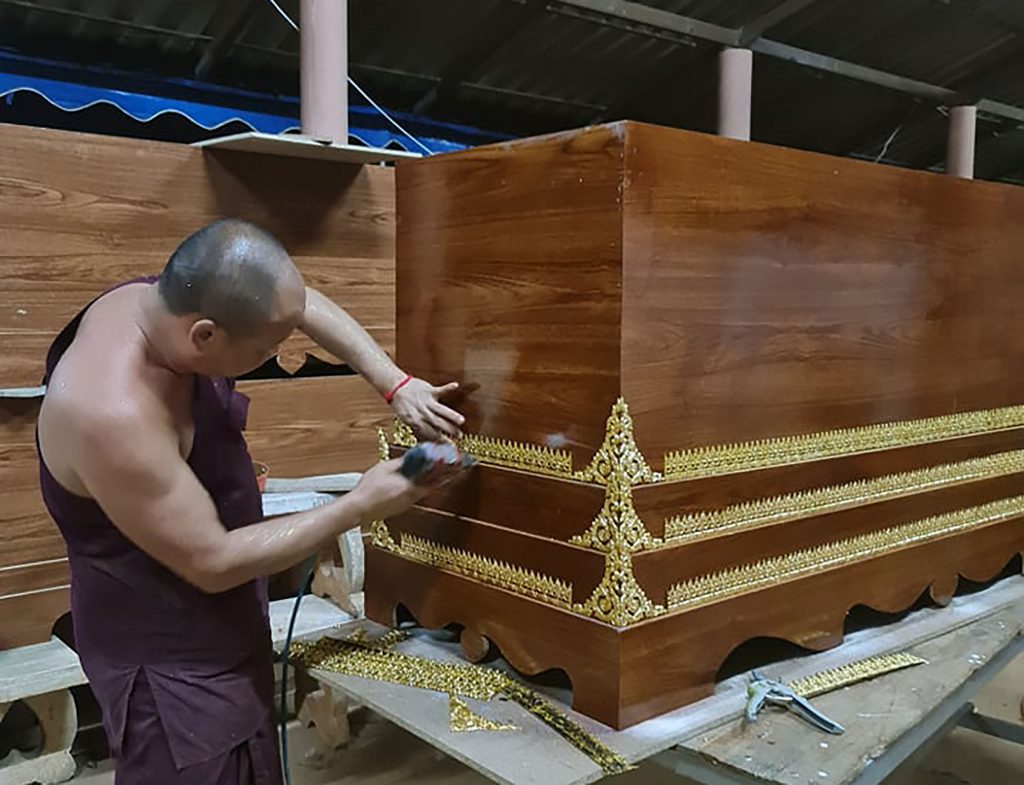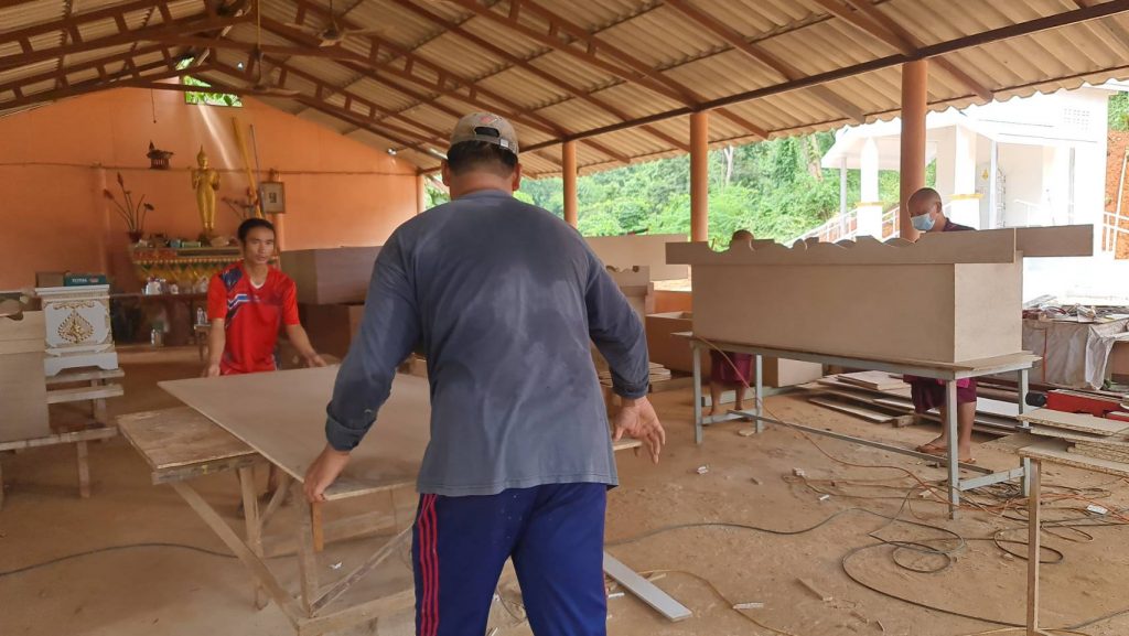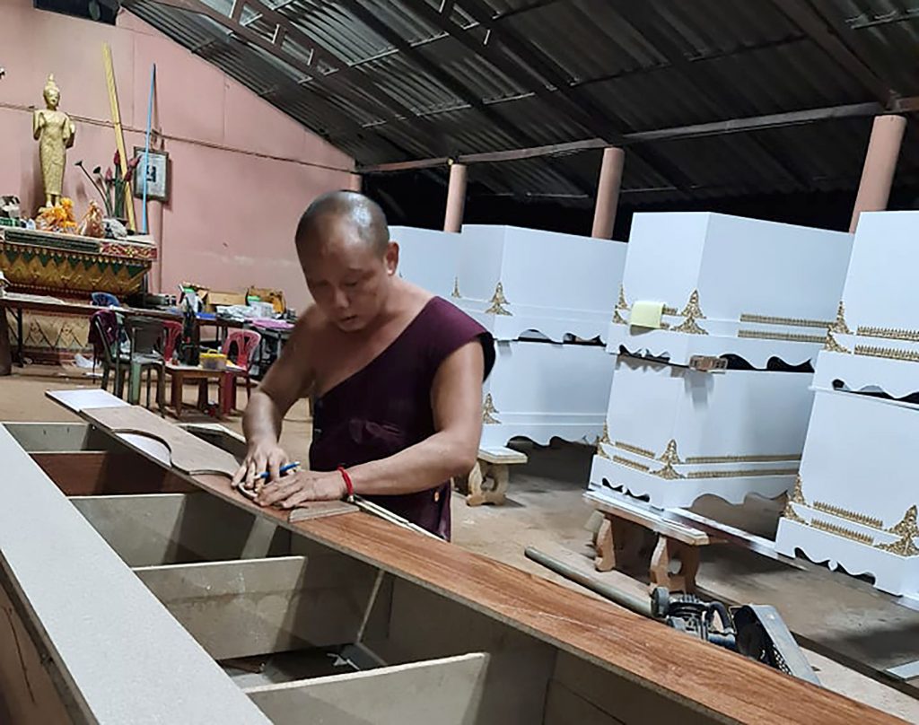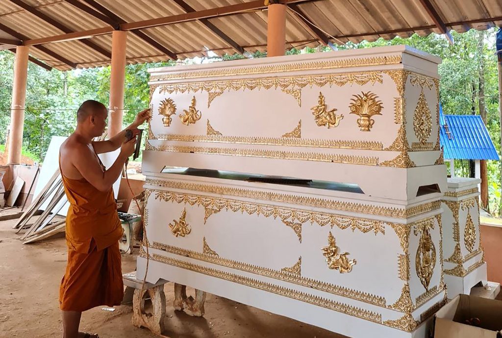 เมื่อเวลา 14.00 น.วันที่ 14 เม.ย. 65 ที่วัดปางมะกง อำเภอเชียงดาว จังหวัดเชียงใหม่ บรรยากาศภายในวัดทางเจ้าอาวาสวัด พร้อมพระลูกวัดกำลังขมักเขม่น ช่วยกันทำโลงศพ เพื่อเตรียมไว้สำหรับการบริจาค โดยโลงศพที่ทำออกมานั้นมีความสวยงามไม่แพ้กับร้านรับทำโลงศพเลย ทั้งการทาสี การฉลุลายไม้ให้เป็นลวดลายที่ออกมามีความปราณีต สวยงาม ซึ่งโลงศพทั้งหมดนี้ไม่ได้มีการจำหน่าย แต่มีไว้เพื่อบริจาคฟรี